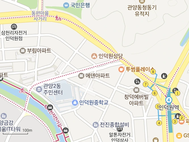 과천대로에서 샛길로 가지 않고 인덕원역으로 내려가면 우회전하자마자 횡단보도가 있는데 횡단보도를 건너서 인덕원 성당 앞길로 쭉 가도 이 로터리가 나온다. 아래 지도에서 동편마을 사거리에서 직진한 골목길과 인덕원 성당 앞 골목길이 관양2동 주민센터 앞에서 만나는 것을 볼 수 있다.