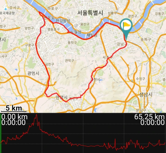 65km 정도의 코스라서 쉬지 않고 달린다면 보통 3~4시간 정도 걸린다. 초행길에는 휴식을 포함해서 약간 더 넉넉하게 시간을 잡자. 순환형 코스라 어디서부터 출발해도 좋으니 집에서 가까운 곳에서부터 시작하면 된다. 수원에 살 때는 안양천 따라서 학의천 합수부에서 시작했고 송파에 사는 지금은 양재천 합수부로 간다.