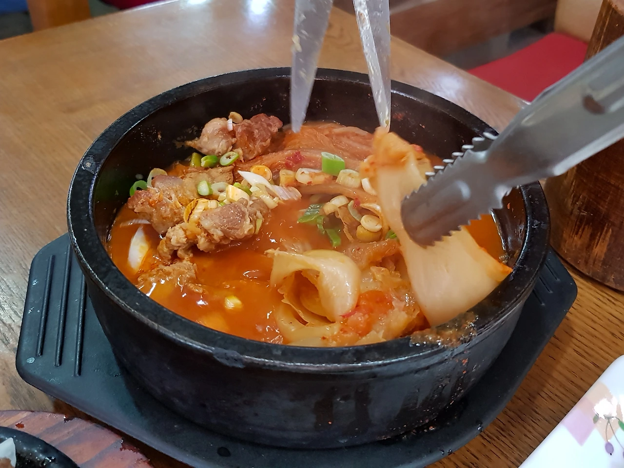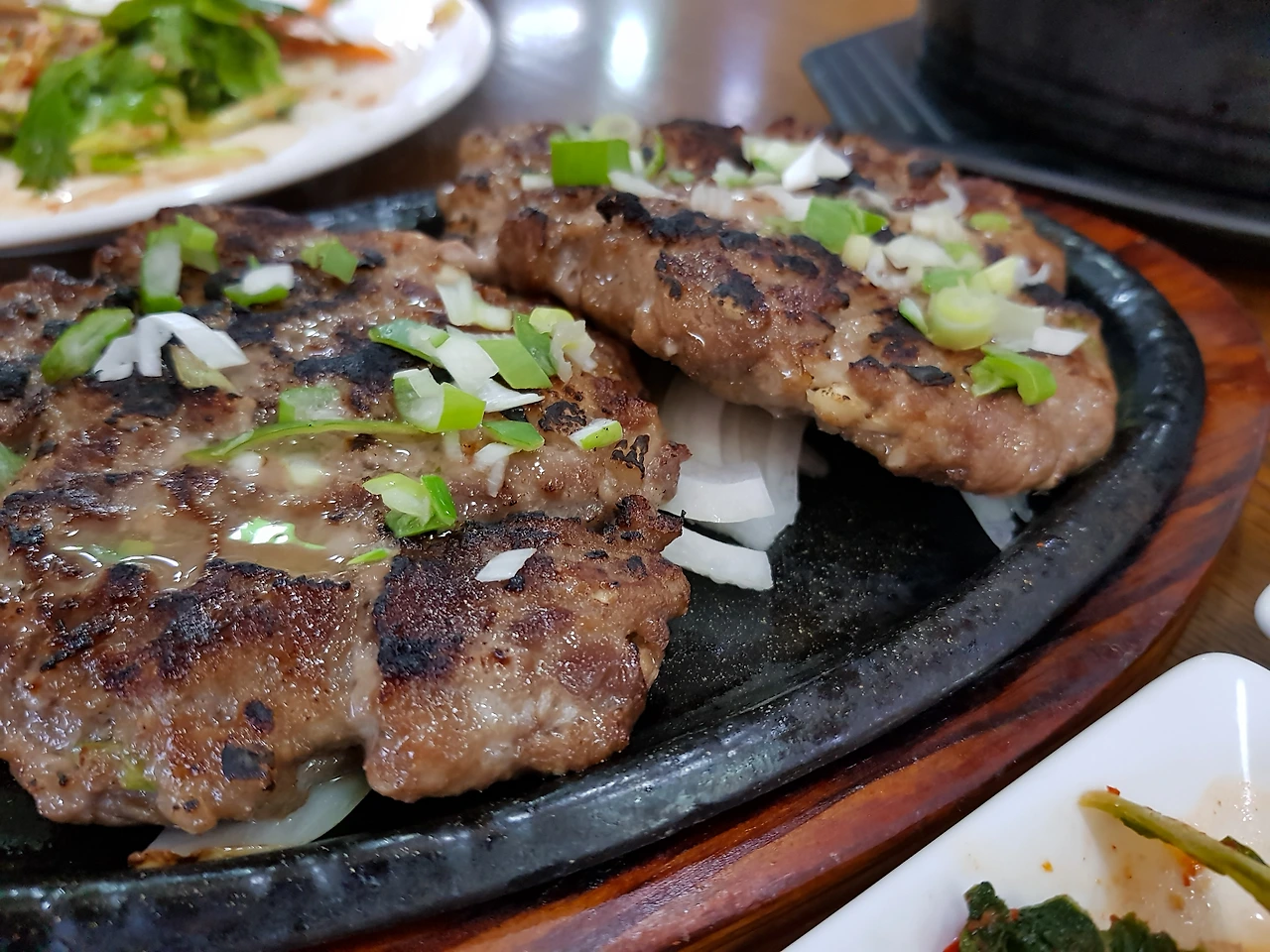 버스로 2시간 가까이 이동해야 하는데 늦장을 부렸더니 벌써 12시다. 운천리에서 출발해서 겨우 4km 정도 달렸지만 점심 시간이긴 하니 점심을 먹고 시작하기로 하고 근처 식당에 들른다. 오늘 점심은 떡갈비와 김치찜... 둘 다 지니님이 좋아하는 음식이다.