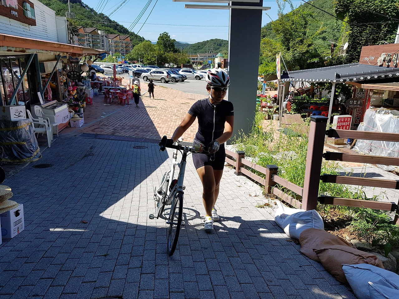 일동 읍내에서 나가자마자 바로 좌회전해서 작은 길로 가야 하는데 아이스크림을 먹을 편의점을 찾느라 길을 지나쳐버렸다. 다시 되돌아가다보니 큰 마트에 벤치와 화장실도 있으니 잠시 쉬어간다.
