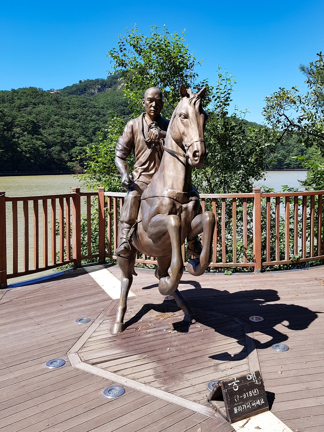 비탈길을 올라가면 바로 산정호수가 보인다. 여기서부터는 산책로가 완만하다. 말 탄 궁예 동상이 있는데 궁예가 왕건에게 쫓겨 도망친 곳이라고 한다. 산정호수 산책로는 궁예의 일대기를 쭉 감상할 수 있게 해놨다고 한다.