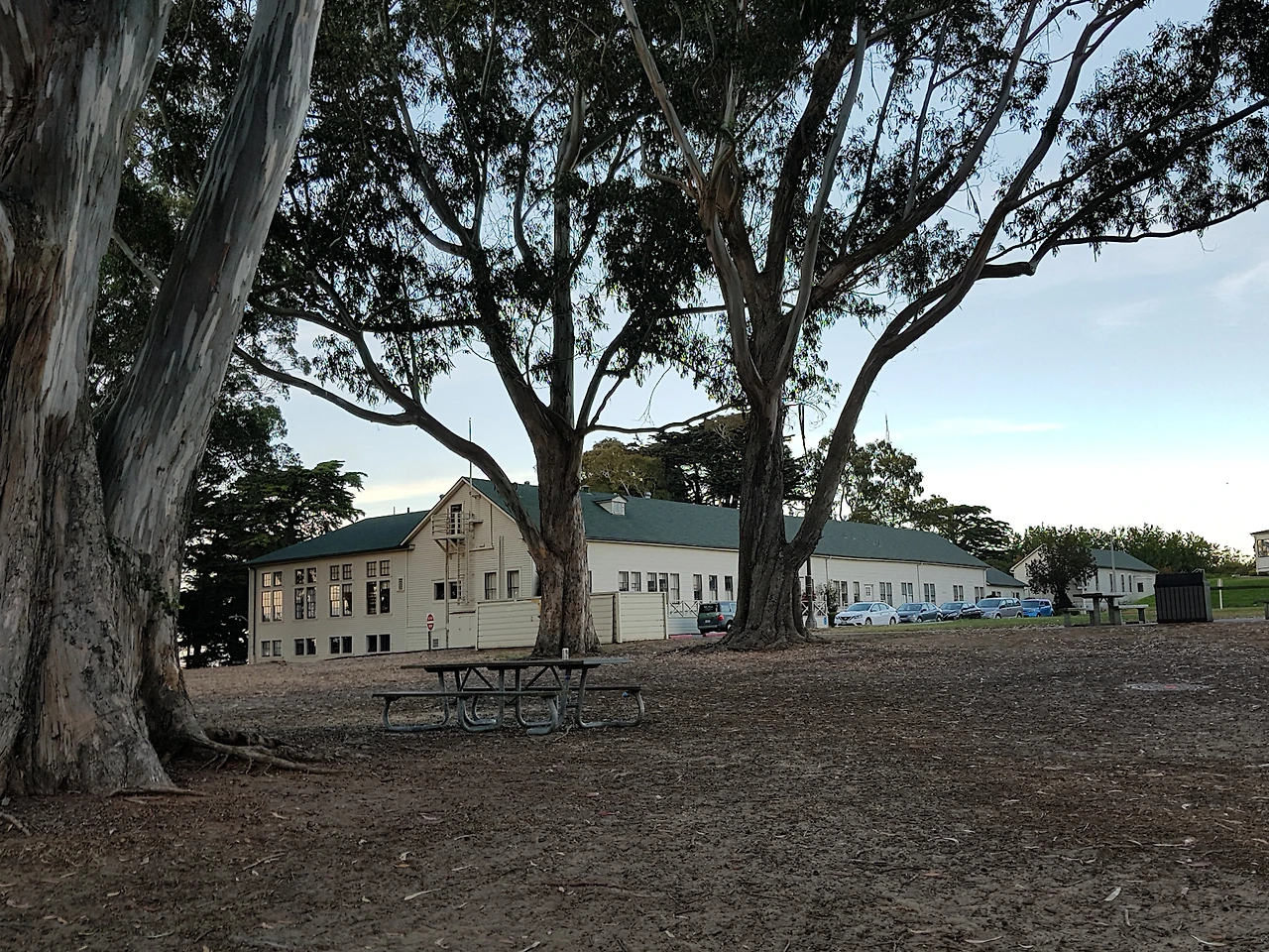 어제 저녁을 먹었던 포트메이슨 문화센터 뒤로 금문교가 보인다. 안개가 뿌옇게 끼어 흐리다.