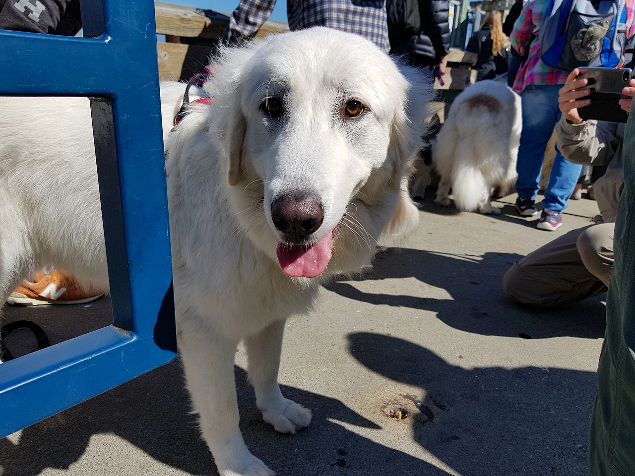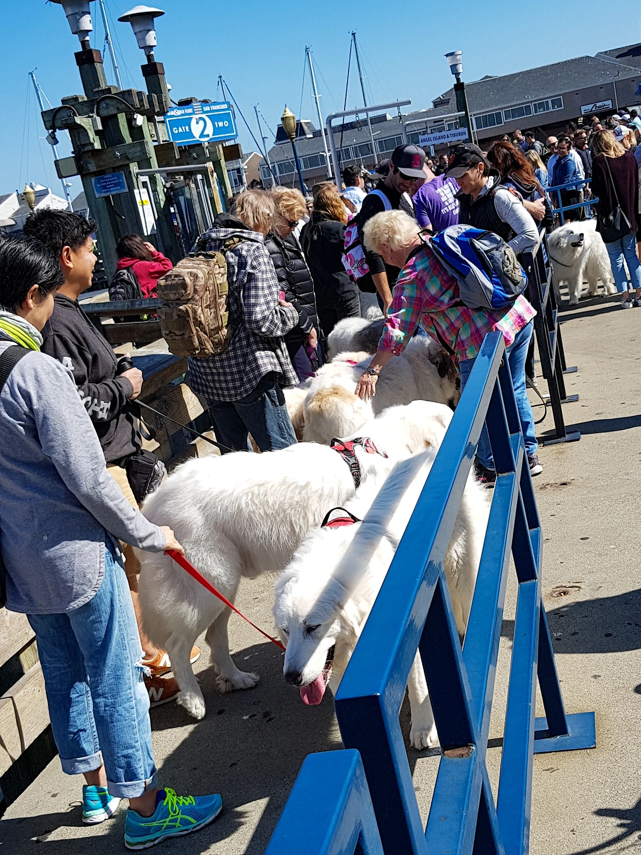 피어41에는 이 배를 타로 티뷰론 가려는 사람들이 로 어마어마하다. 그 중에 사모예드로 보이는 대형견 동호인들의 모임이 있는지 커다란 흰색 개들이 잔뜩 있다. 이렇게 많으니 꽤나 진풍경이다.