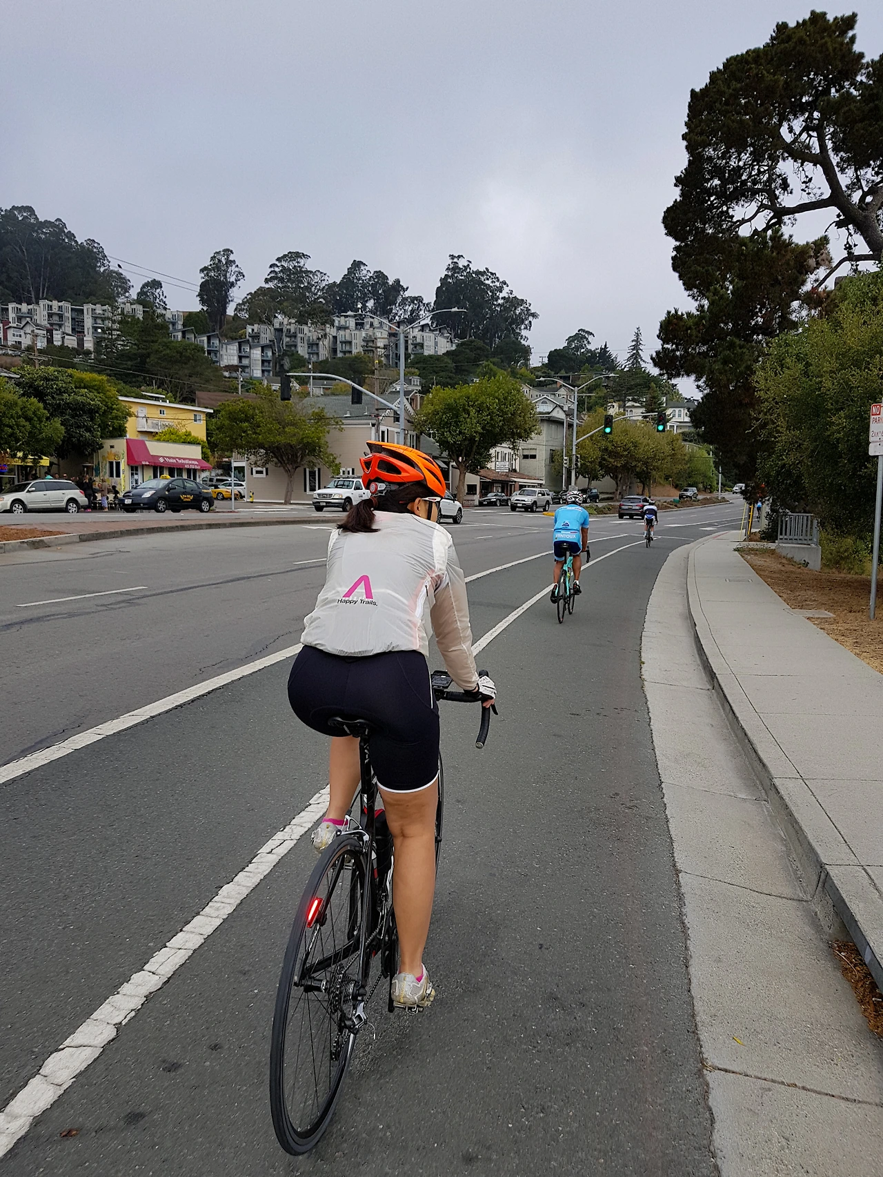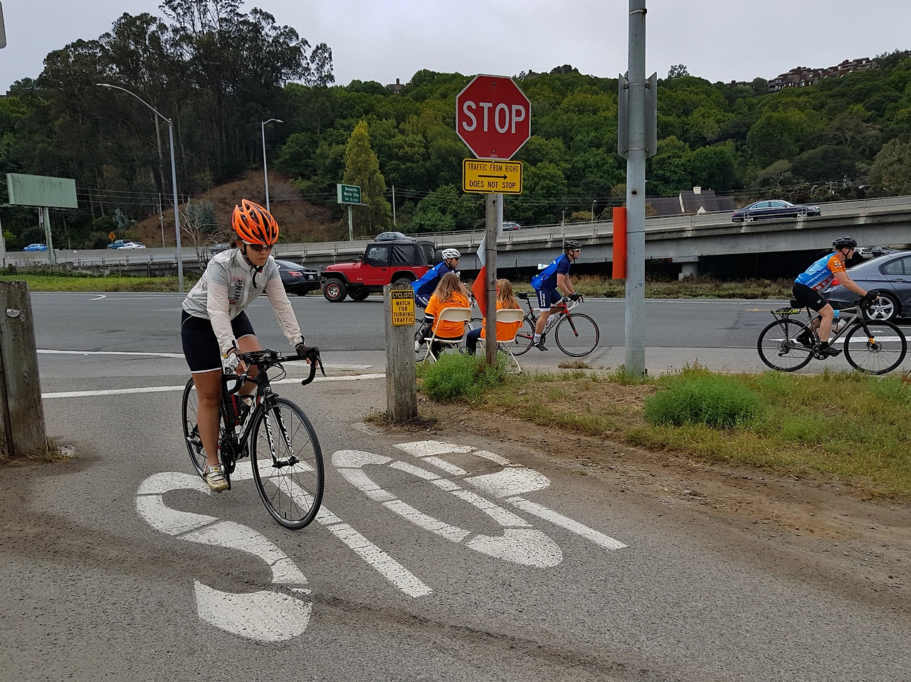 소살리토가 거의 끝날 무렵, 자전거 대행진 참가자들은 도로를 따라서 다른 곳으로 달리고 우리는 자전거 도로로 빠진다. 갈림길 가운데 두 소녀가 앉아서 방긋방긋 웃으면서 참가자들에게 방향을 알려준다.