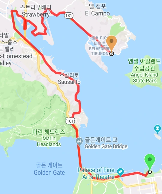 식당들이 모여있는 바닷가에 도착했다. 숙소에서 여기 티뷰론까지 25km, 금문교 비스타 포인트를 들렀으면 거리가 조금 더 늘어났을 듯하다.