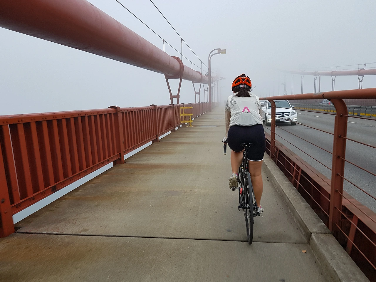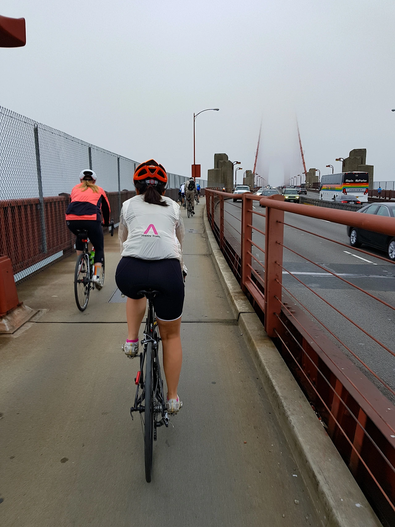 주탑이 안개에 가려진 금문교가 점점 가까워진다. 샌프란시스코의 아침은 해무가 잔뜩 낄 때가 많아서 맑은 아침의 금문교를 보기는 쉽지 않다고 한다.