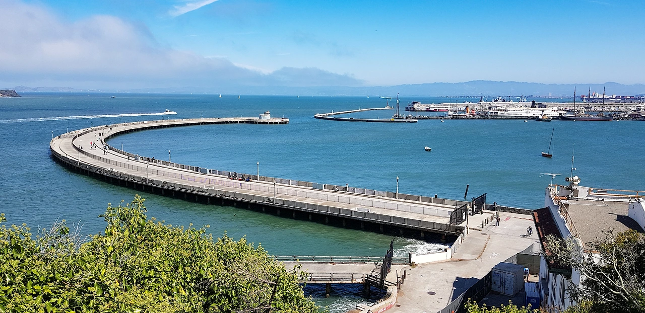 피어39의 끝에서 알카트라즈섬과 그 뒤의 티뷰론, 소살리토가 보인다.