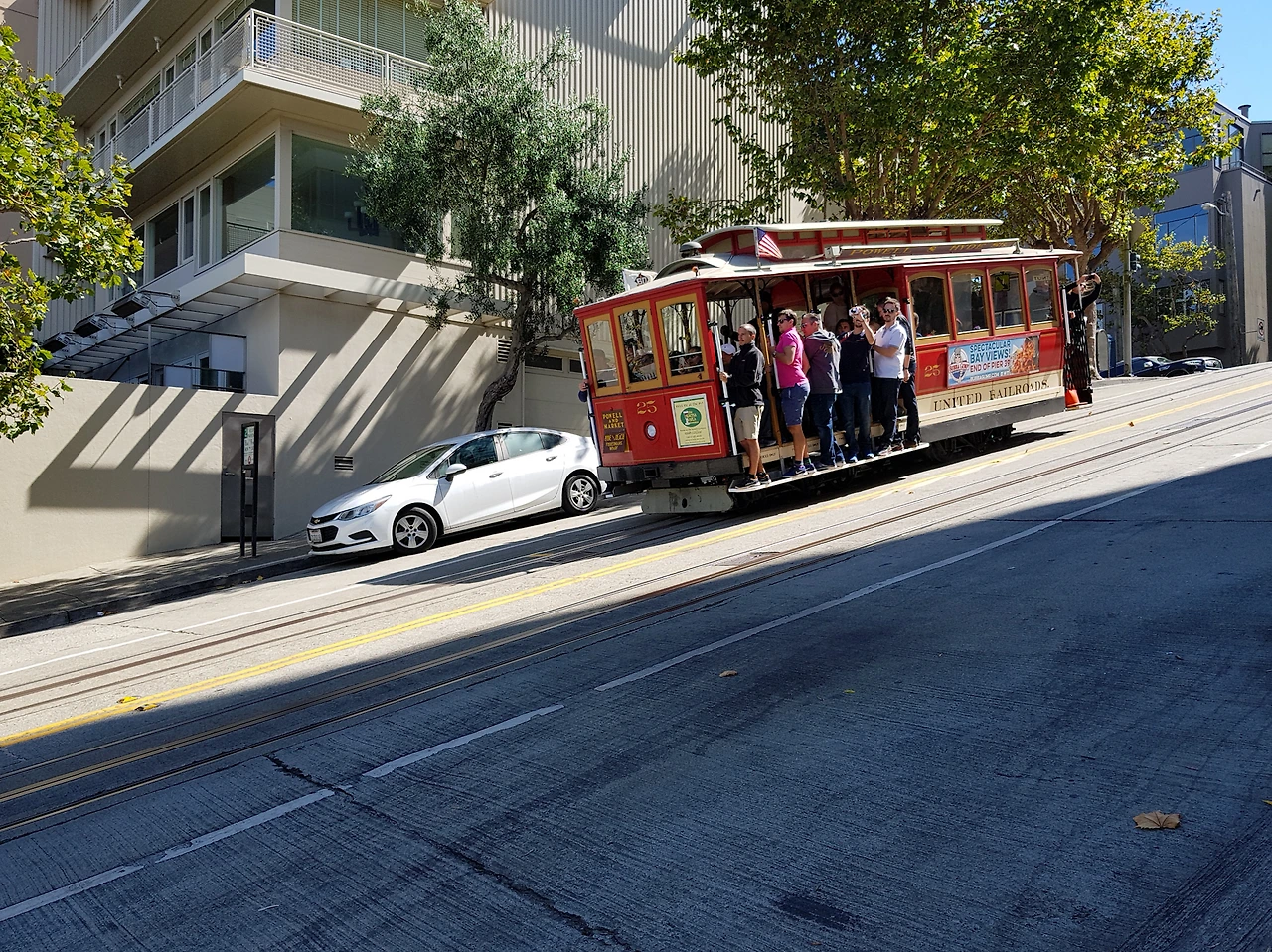 올라가는 사이에 미끄러지듯 내려오는 케이블카가 있다. 왜 전철 비슷하게 생겨서 전철이나 트램이라 부르지 않을까 싶은데 케이블카 라인 근처를 가보면 뭔가 동력이 작동하고 있는 소리가 난다. 땅 속에 케이블이 계속 돌아가고 그립맨이라 불리는 운전수가 차량에 이 케이블을 얼마나 강하게 연결하느냐에 따라서 속도가 변한다고 한다.