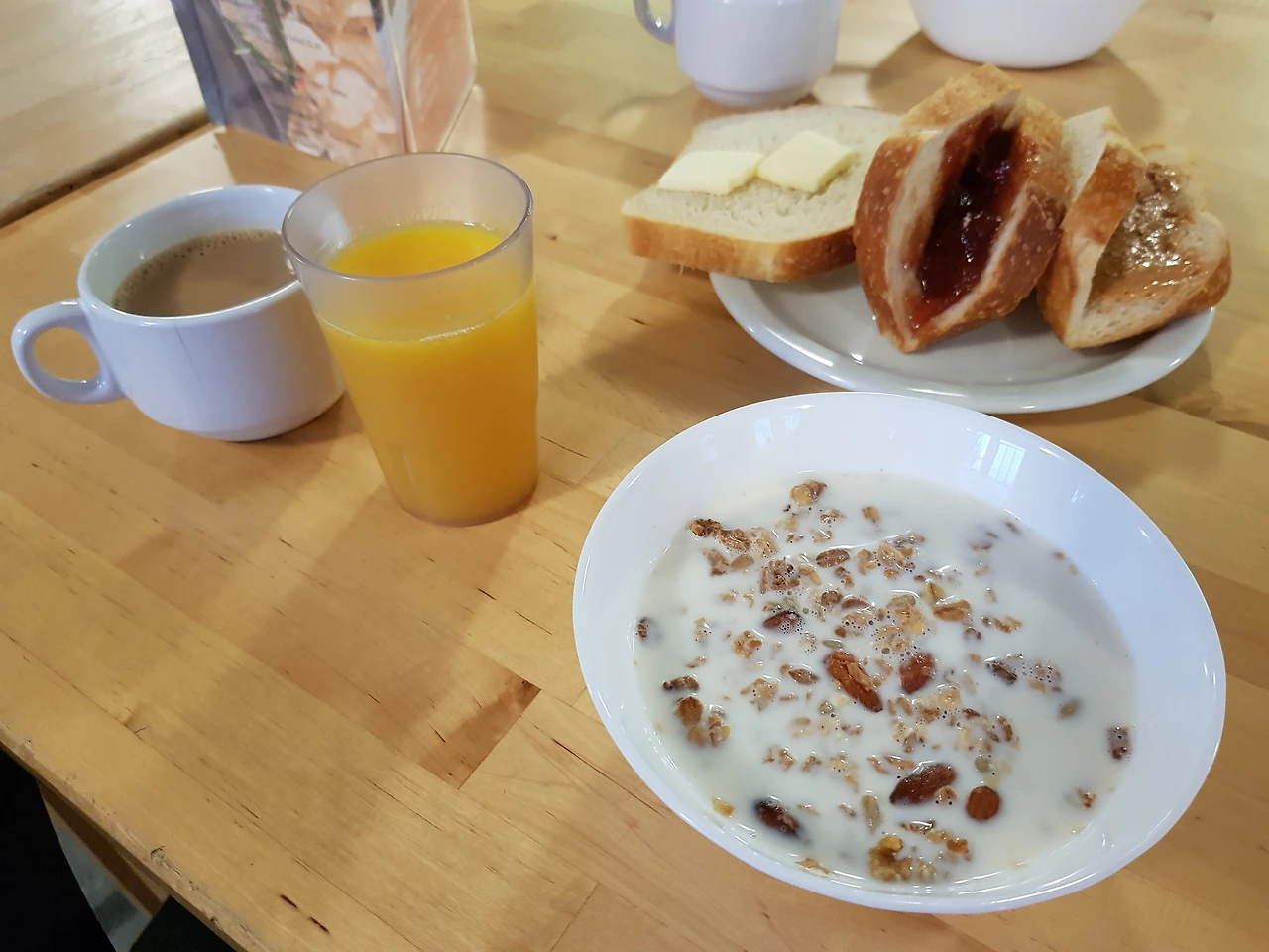 아침은 호스텔에서 간단하게 제공된다. 요거트, 빵, 쥬스, 커피, 우유, 시리얼, 그리고 사과 정도다. 좋은 숙소의 조식에 비하면 조금 부족하지만 안 주는 것보단 훨씬 좋다. 항상 느끼지만 내 입맛에 미국 커피는 영 안 맞는다.