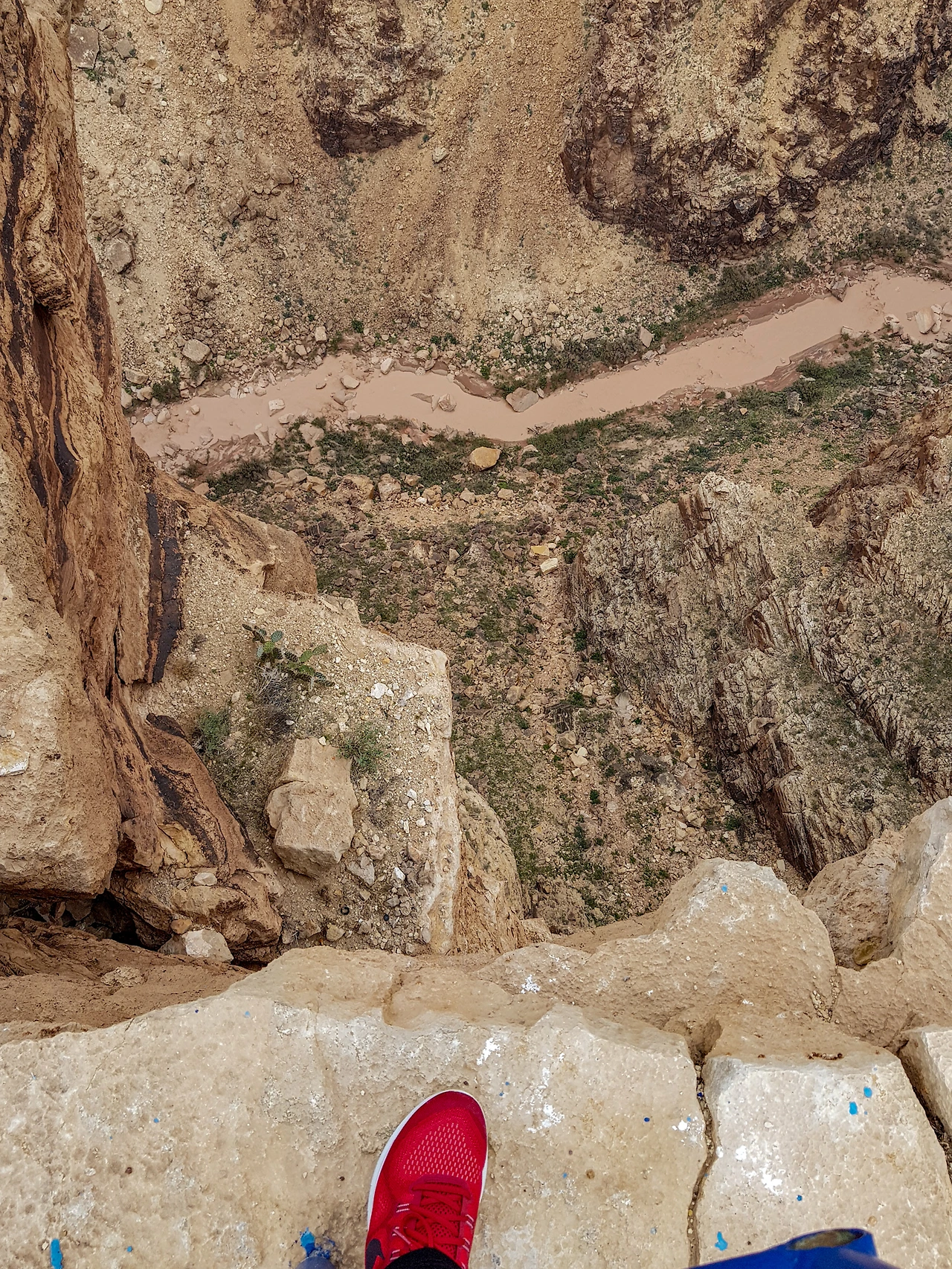 우와 포인트의 가장 아찔한 바위 위에서 아래를 바라본다.
