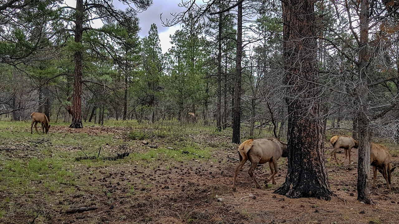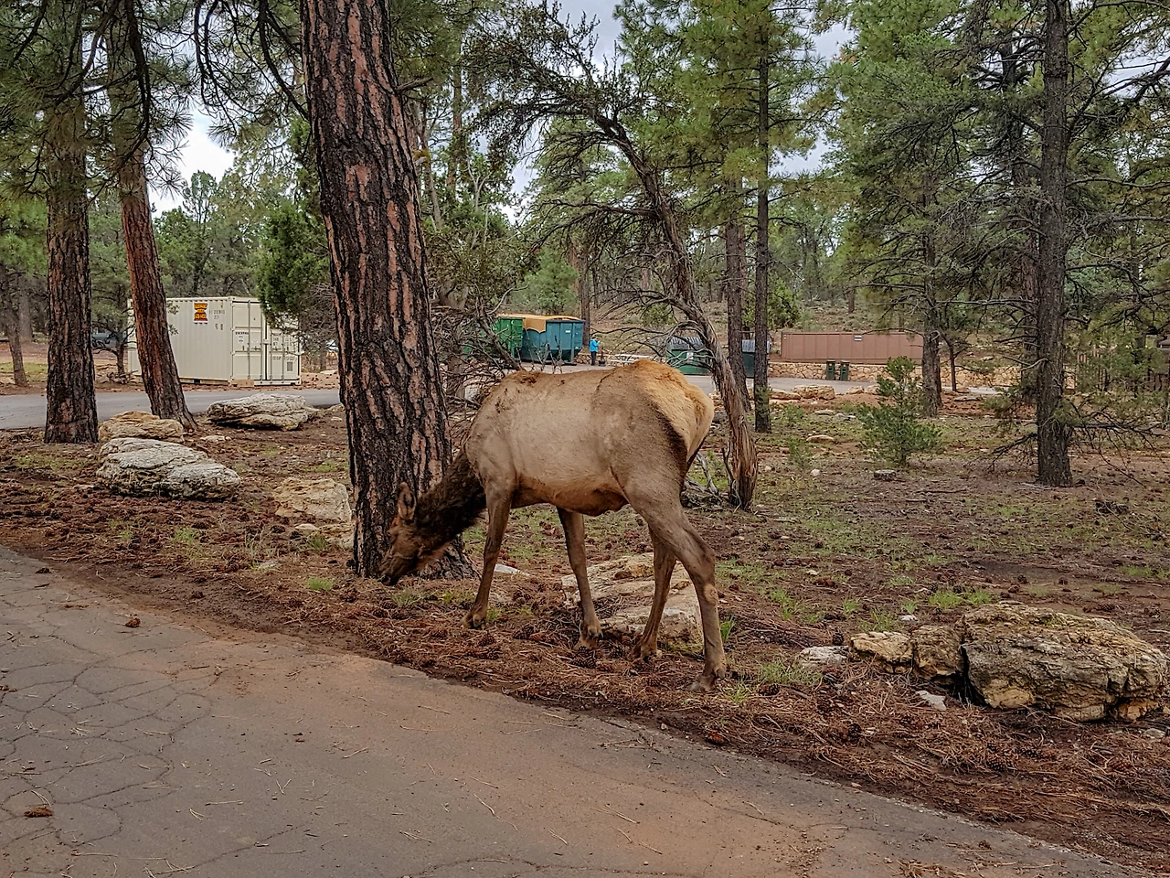 오늘은 데저트뷰 포인트에 갔다가 플래그 스태프에서 늦은 점심 겸 저녁을 먹고 공항으로 돌아가야 한다. 데저트뷰로 가는 길에 사슴 무리가 보인다. 뒤쪽 멀리 뿔이 어마어마하게 긴 숫사슴도 있다. 지니님은 아침에 사슴을 못 보았으니 잠깐 멈춰서 구경한다. 지나가던 다른 차들도 대부분 멈춰서 구경하느라 바쁘다.