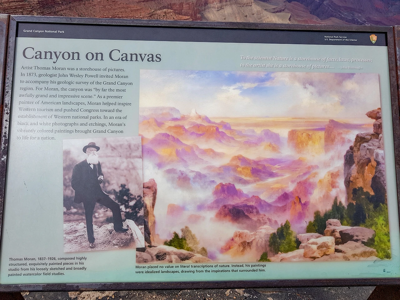 이 모란 포인트는 토마스 모란이라는 그랜드 캐년을 즐겨그리던 화가가 자주 찾던 곳인 듯하다. 그가 그린 그림 중에는 그랜드 캐년을 화사하고 밝게 표현한 작품들이 많다. 어제 저녁에 붉게 타오르는 모습과 오늘 안개비에 스며드는 모습을 보니 토마스 모란이 그랜드 캐년을 왜 이렇게 그렸는지 이해도 되는 것 같다.