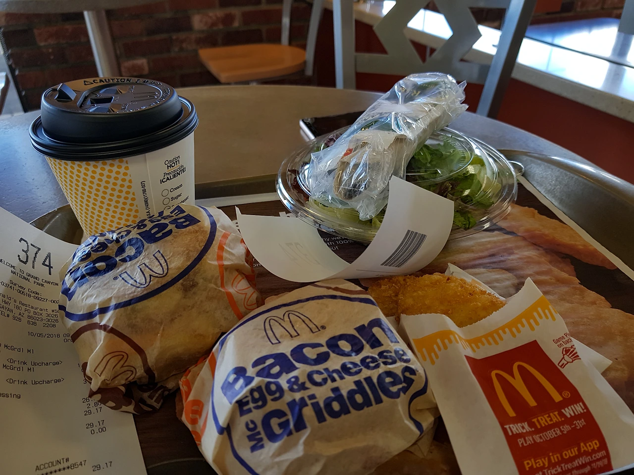 맥모닝 세트 두 개에 샐러드를 하나 먹었는데 은근히 비싼 느낌이다. 이번 여행에서는 대부분 아침을 주는 숙소에 묵다보니 맥도널드는 들를 때마다 음료수만 마셨는데 처음으로 맥모닝을 먹는다.
