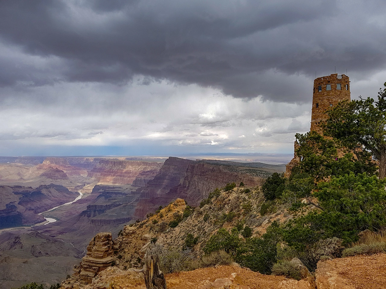 전망탑에서 나와서 주변을 돌아본다.콜로라도 강과 그랜드 캐년을 배경으로 우뚝 서있는 전망탑이 볼만하다. 이렇게 배경에 잘 어우러지니 현대식 전망대보다 훨씬 운치가 있는 것 같다. 나름 유명한 곳인데다가 그랜드캐년 국립 공원 동문에서 가깝기 때문에 관광객이 많은 편이다.