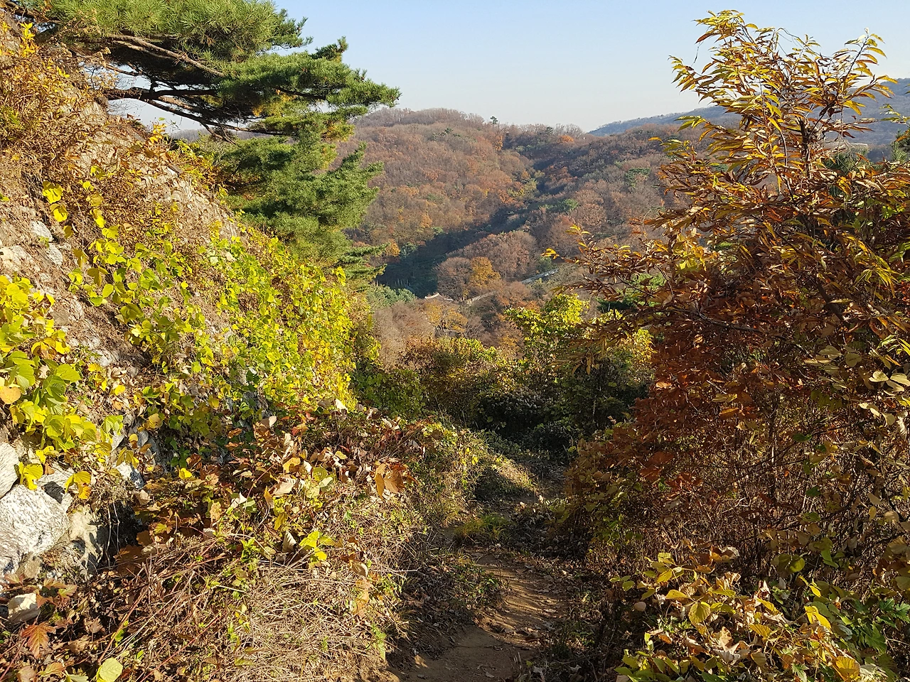 성벽 바깥은 성벽을 따라서 좁은 등산로가 이어진다. 올라오면서 체력을 상당히 소모한 지니님은 여기서도 힘들어한다. 더군다나 성벽이란 것이 성문이나 암문이 흔한 것이 아니라서 남문에 도착할 때까지 다시 성벽 안 쪽으로 들어갈 수도 없다.