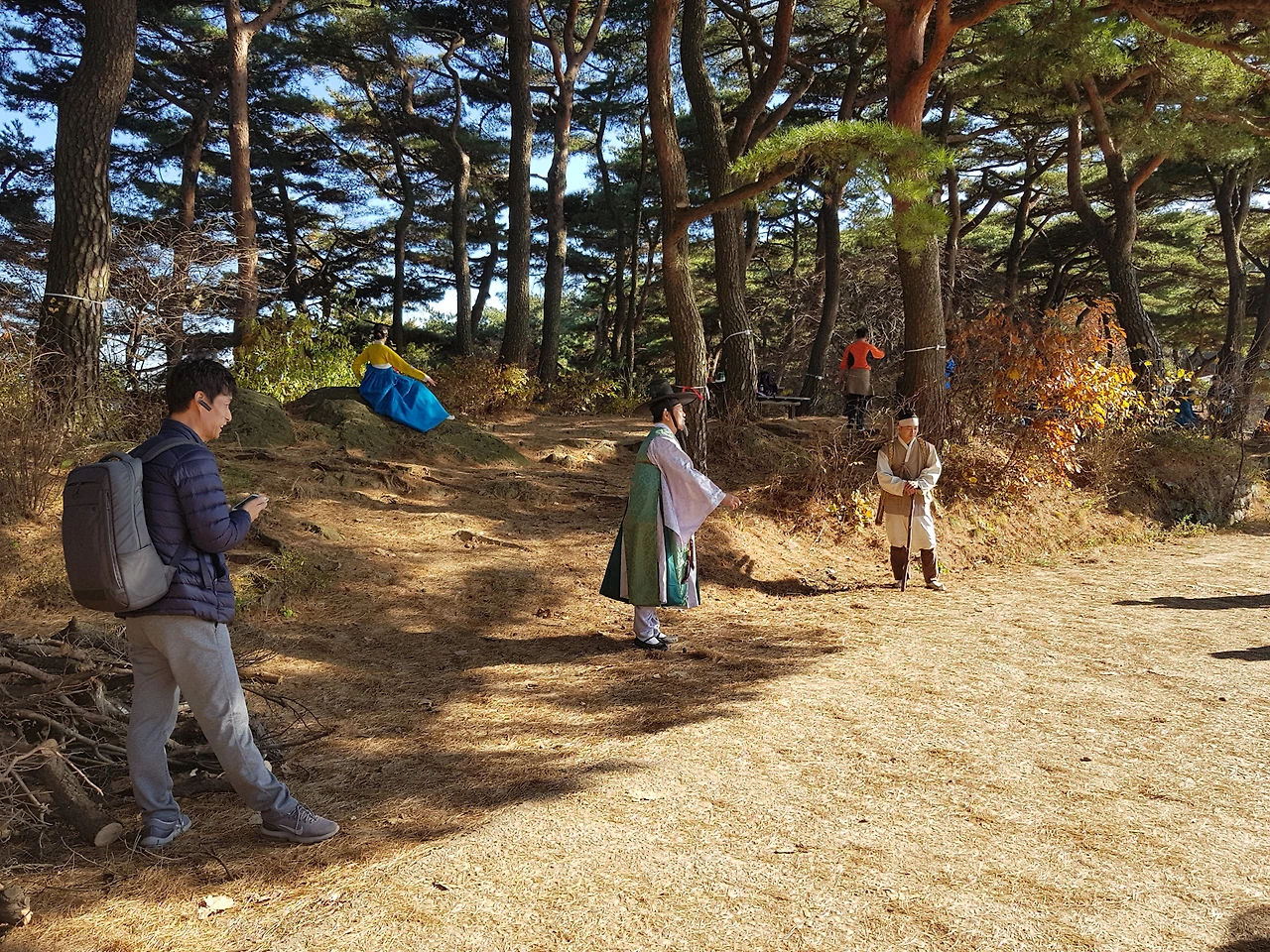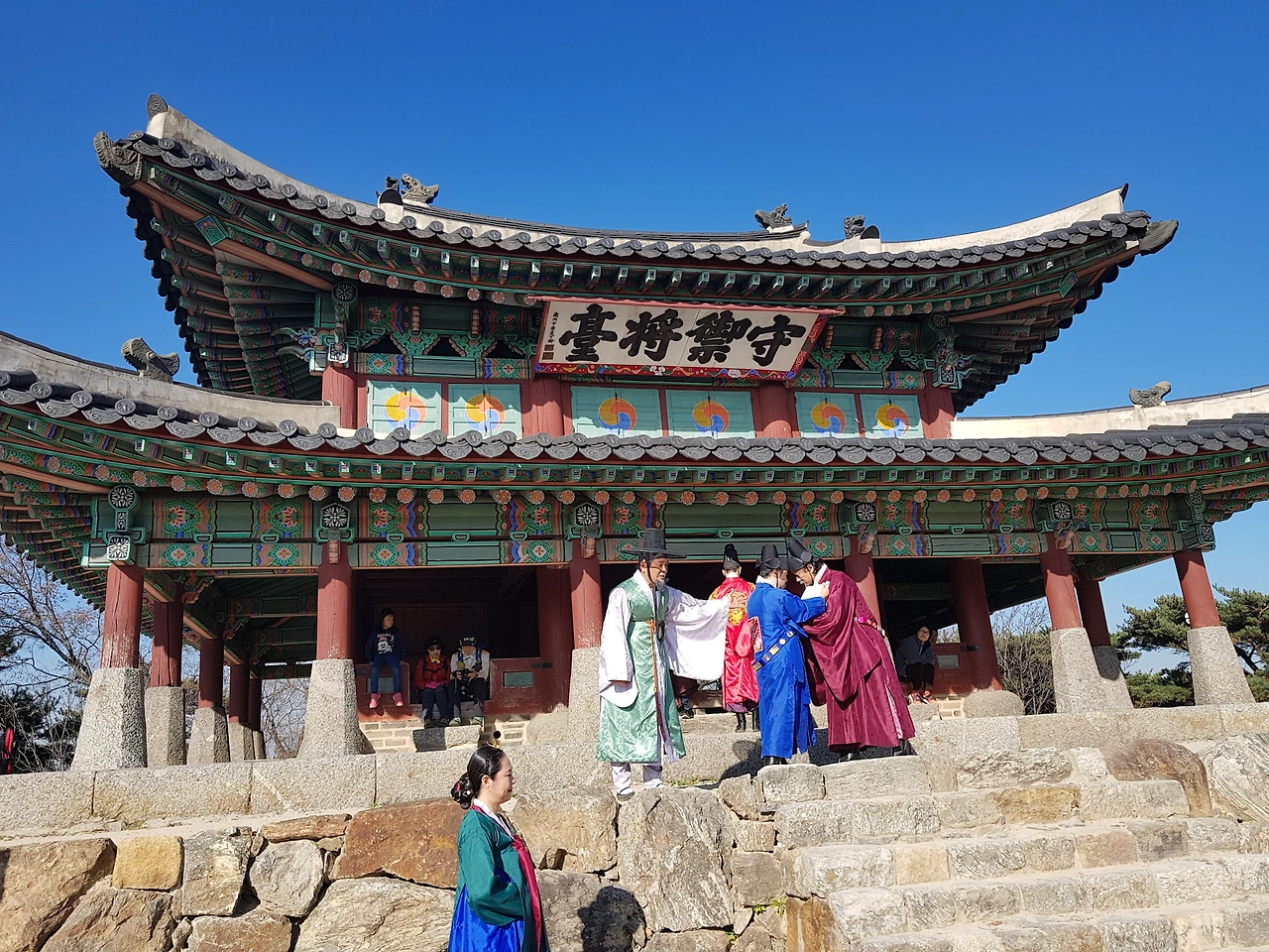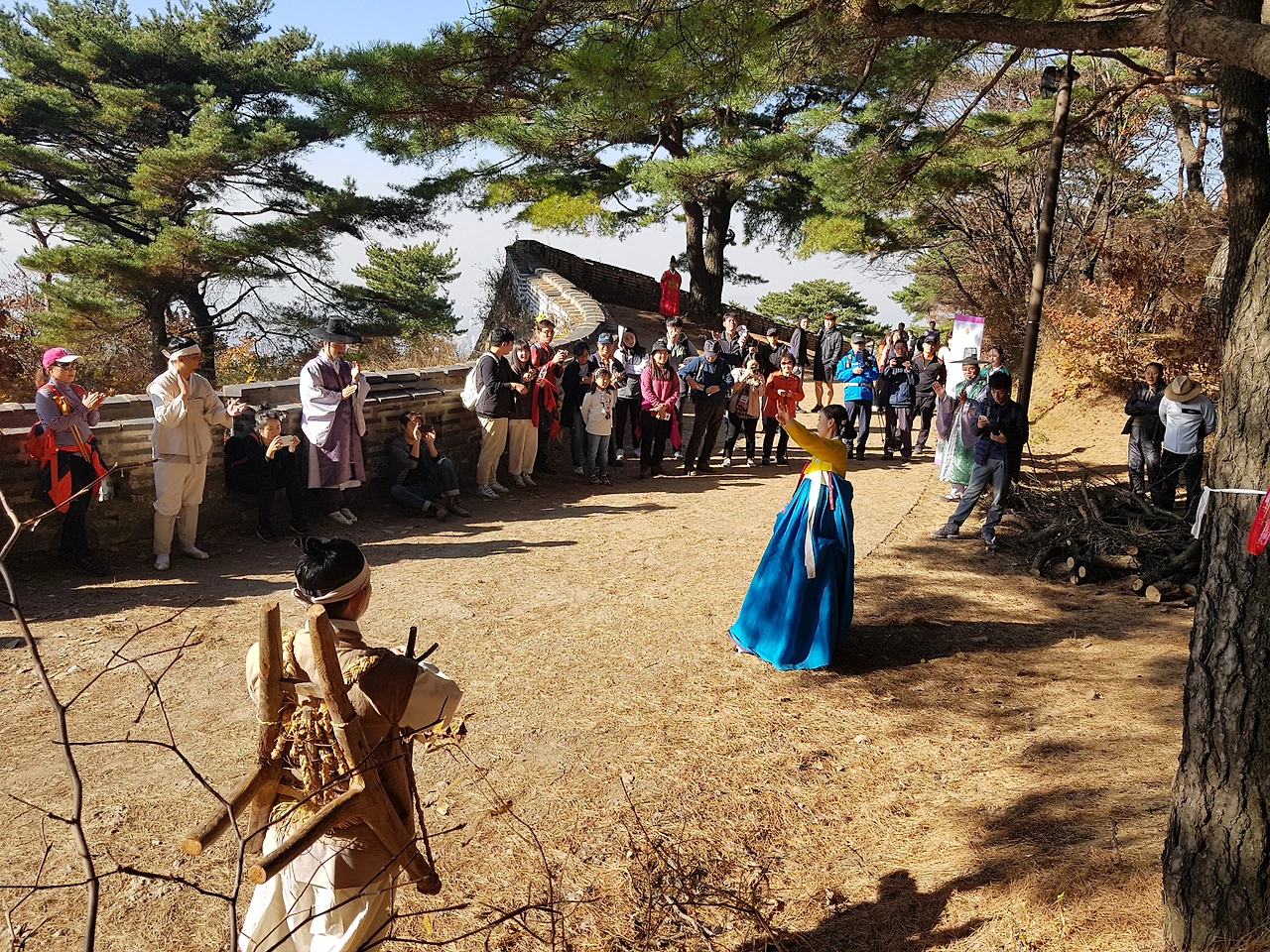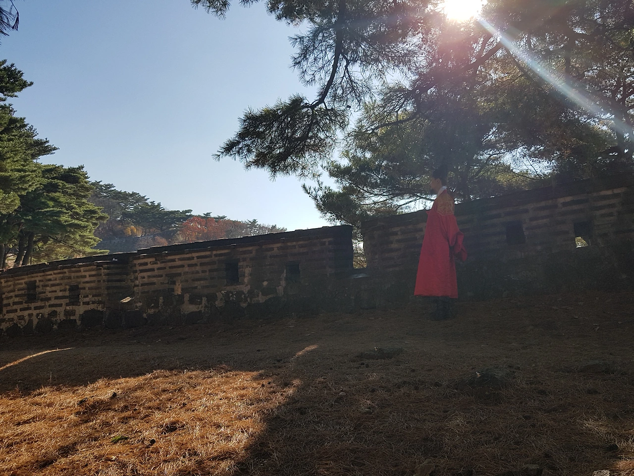 성벽에서 풍경을 보고있는데 왠 공연이 한 차례 끝나고 부지런히 이동한다. 임금 분장을 한 연기자도 있다. 임금이라고 해봐야 선조와 함께 조선 최악의 왕으로 1,2위를 다투는 인조일 뿐이다.
