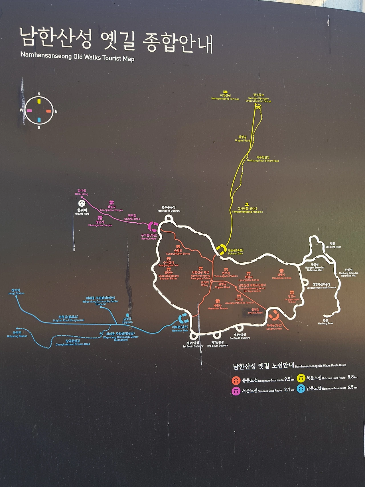 가는 길도 초입부터 여러 갈래로 나뉘어서 예전에는 성불사 옆으로 올라갔는데 이번에는 다른 방향으로 가게 되었다. 등산로 입구에 안내판이 있다. 어떤 식으로 가든 남한산성으로 들어가서 성남 방향으로 내려갈 예정이다.