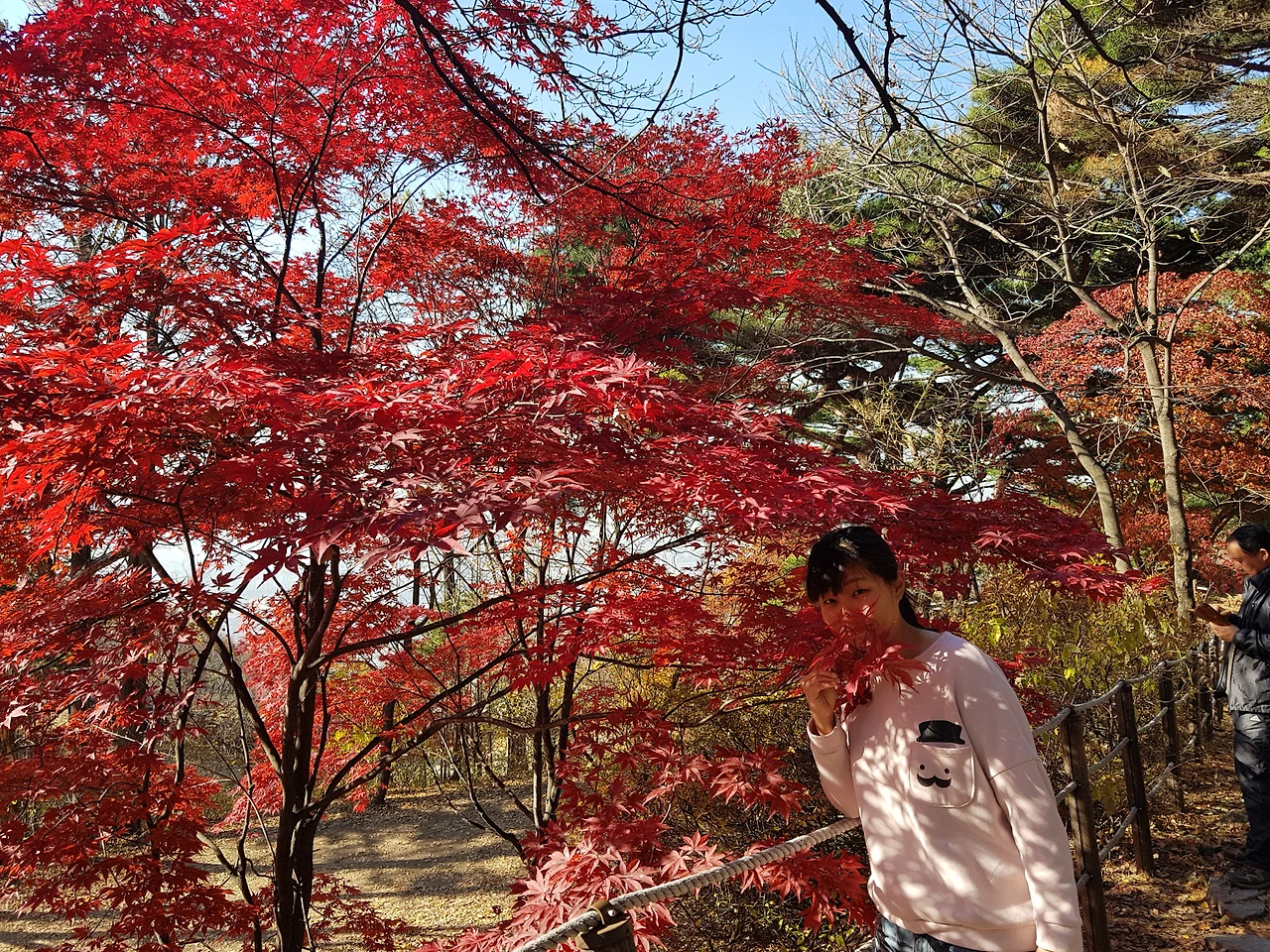 수어장대 입구에 빨간 단풍이 너무 아름답다. 지니님과 함께 사진에 담아본다.