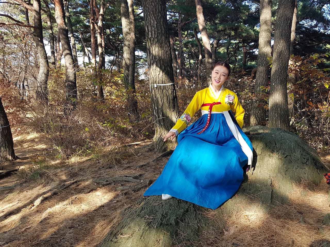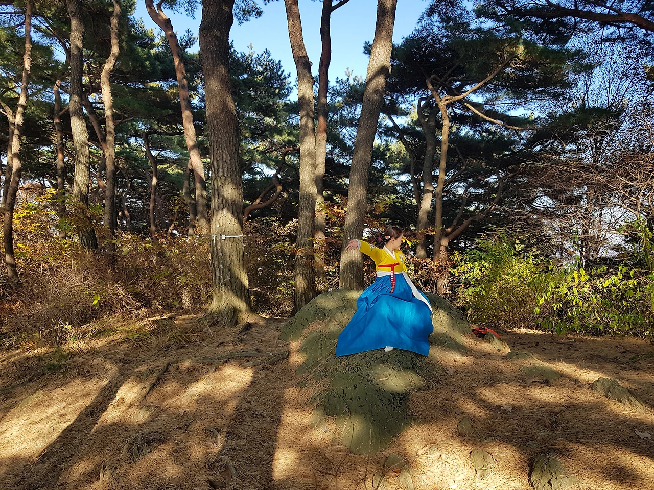 한복을 곱게 차려입은 여성분께서 바위에 앉아있다.