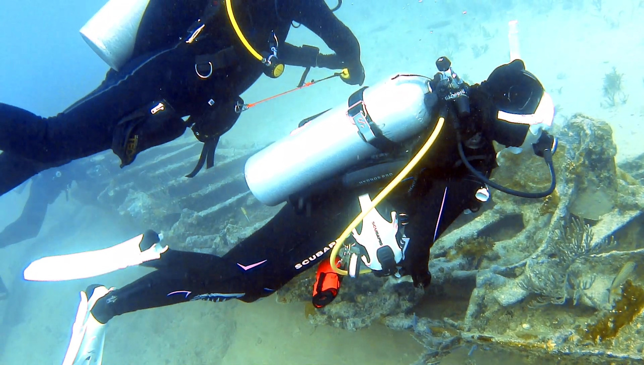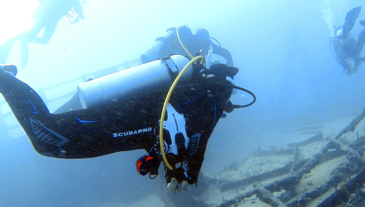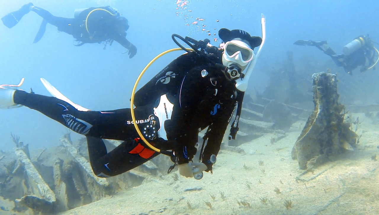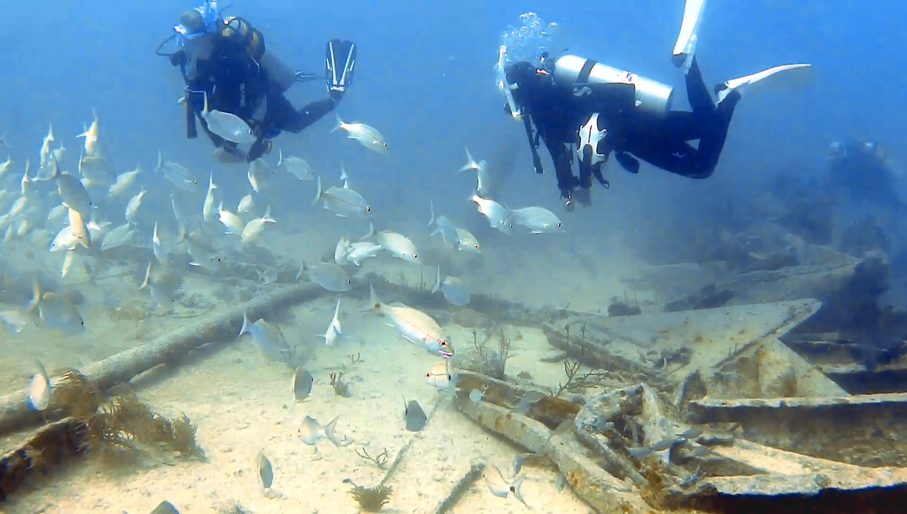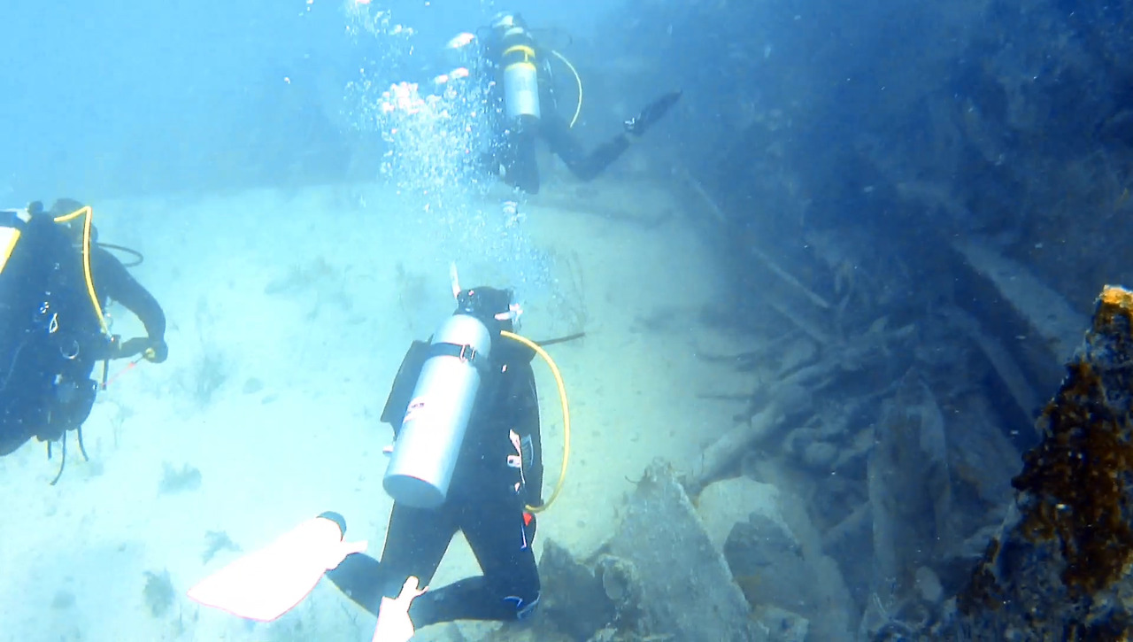 시야가 썩 좋지 않지만 큰 문제는 없다. 해저 여기저기에 배 파편이 널려 있다.