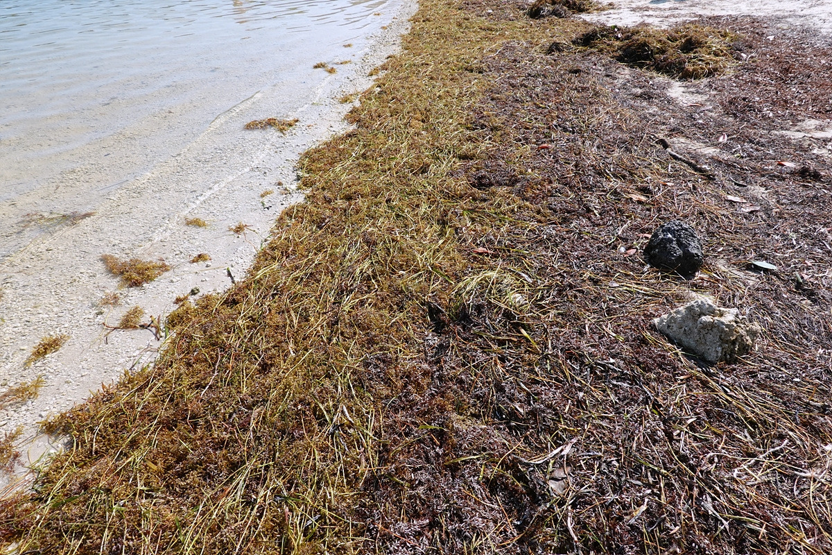 이 해초 비린내의 원인인 해초들이 바닷가에 잔뜩 밀려와있다.