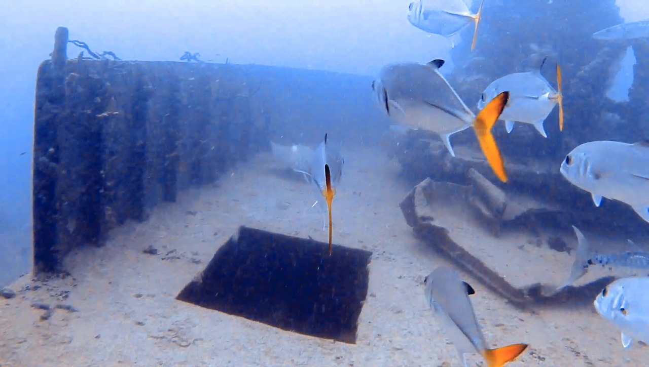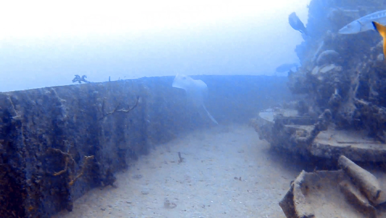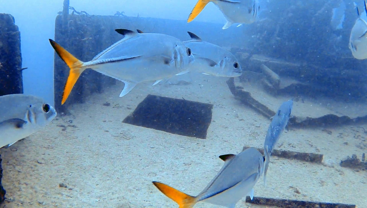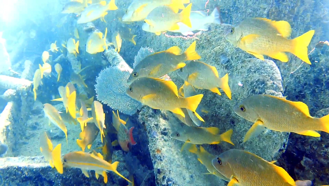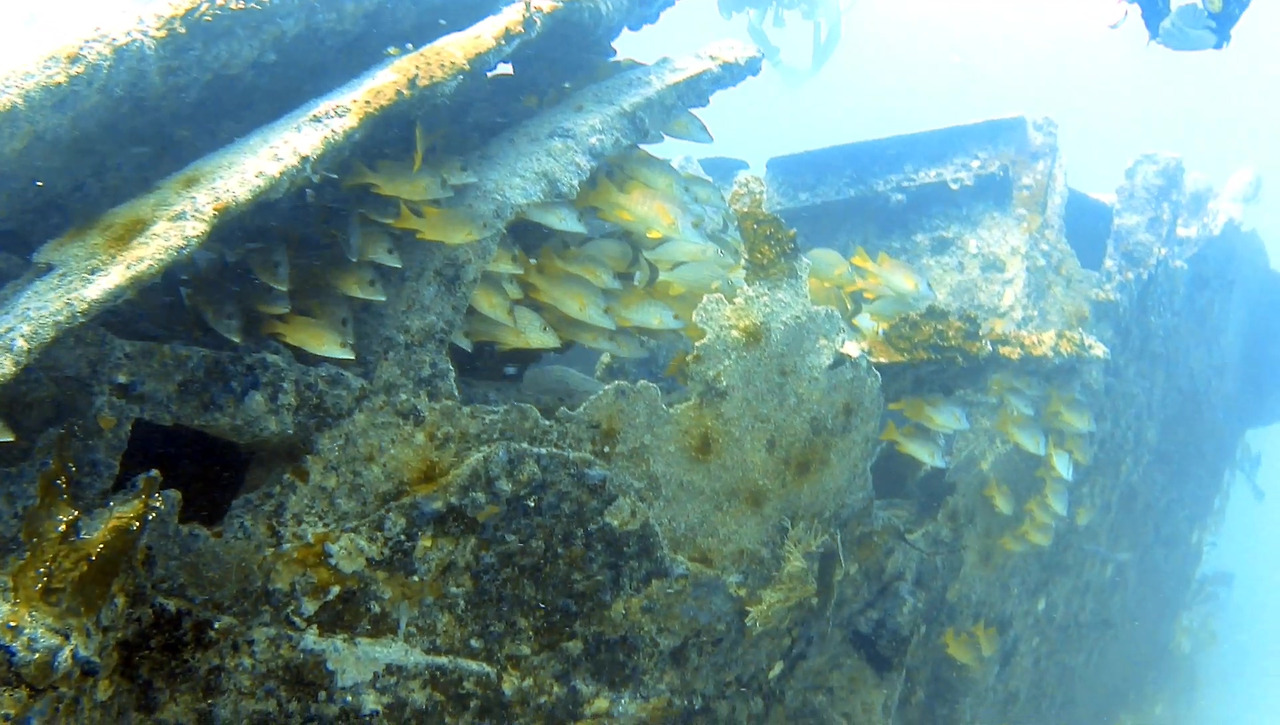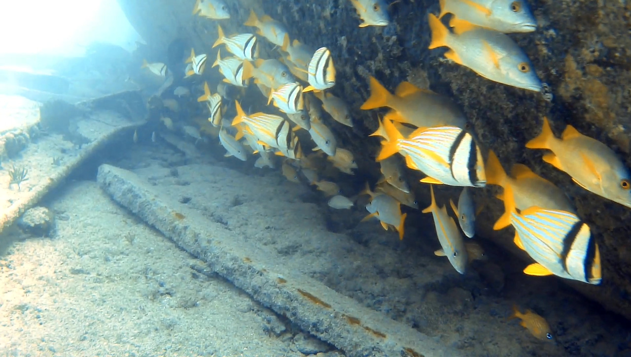 화물선이지만 이미 인양 업체가 거하게 수거해갔기 때문에 화물이 있었던 갑판 위는 텅 비어있다. 그 텅 빈 공간을 물고기 떼들이 가득가득 채우고 있다.