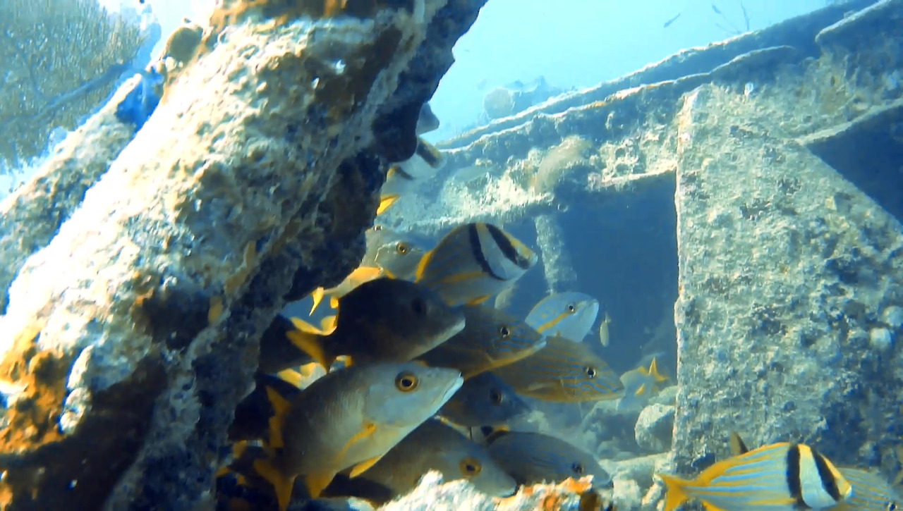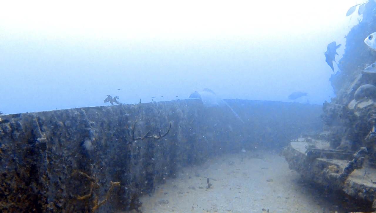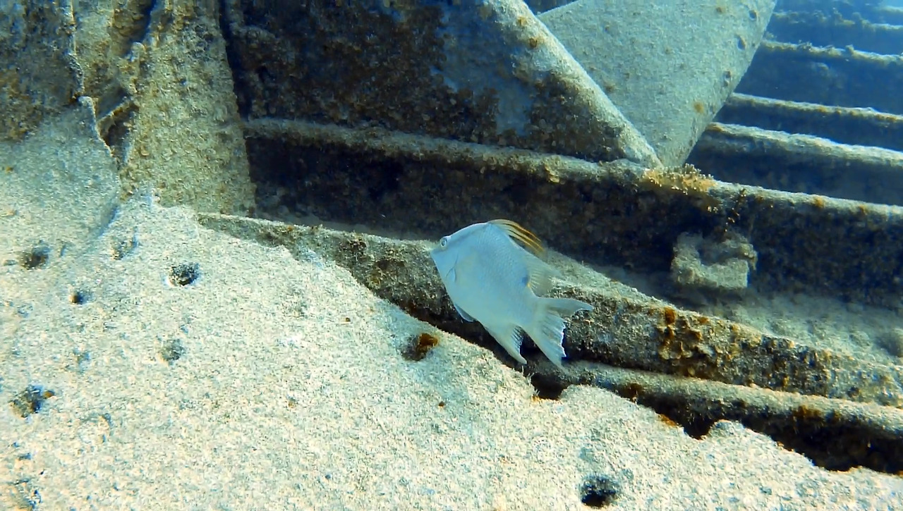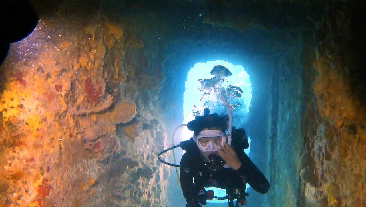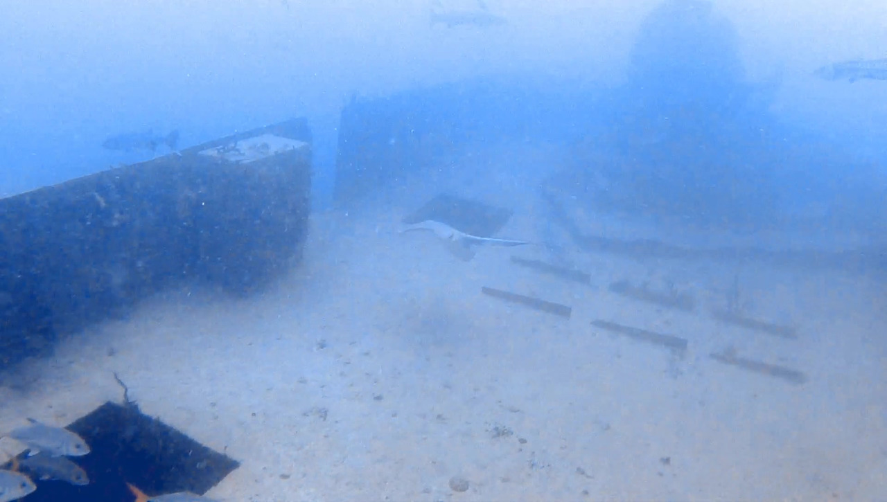 화물선이지만 이미 인양 업체가 거하게 수거해갔기 때문에 화물이 있었던 갑판 위는 텅 비어있다. 그 텅 빈 공간을 물고기 떼들이 가득가득 채우고 있다.