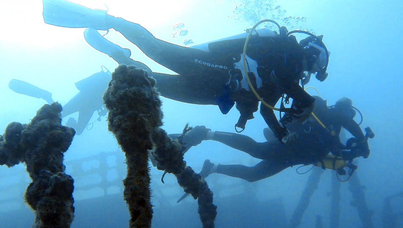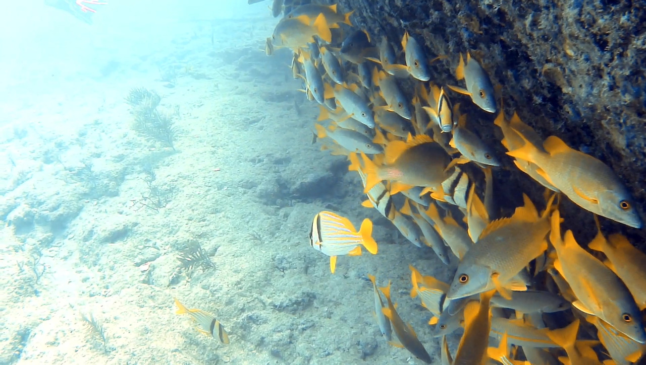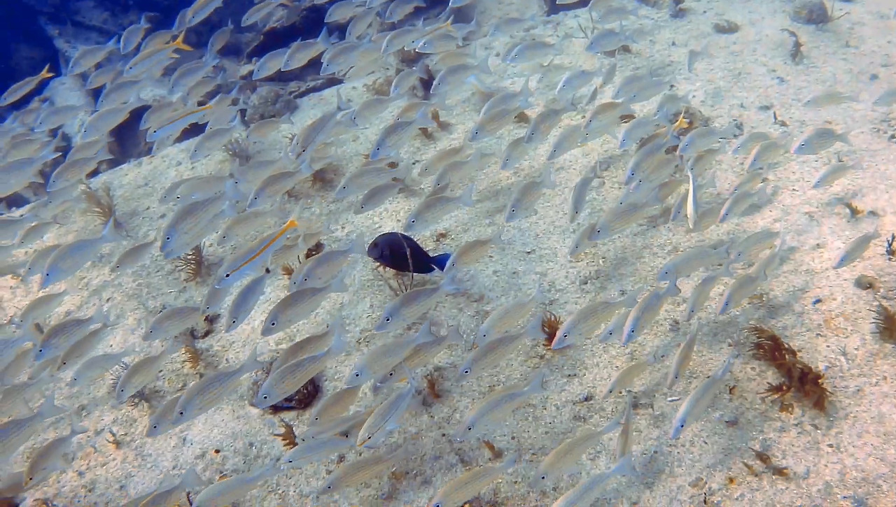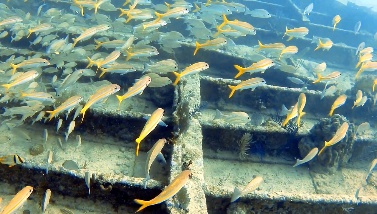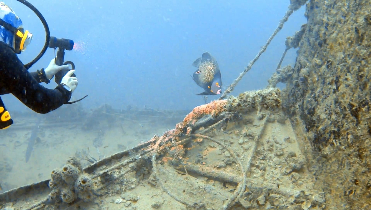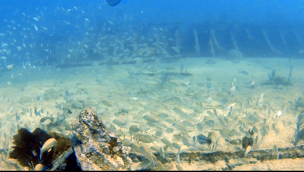 화물선이지만 이미 인양 업체가 거하게 수거해갔기 때문에 화물이 있었던 갑판 위는 텅 비어있다. 그 텅 빈 공간을 물고기 떼들이 가득가득 채우고 있다.