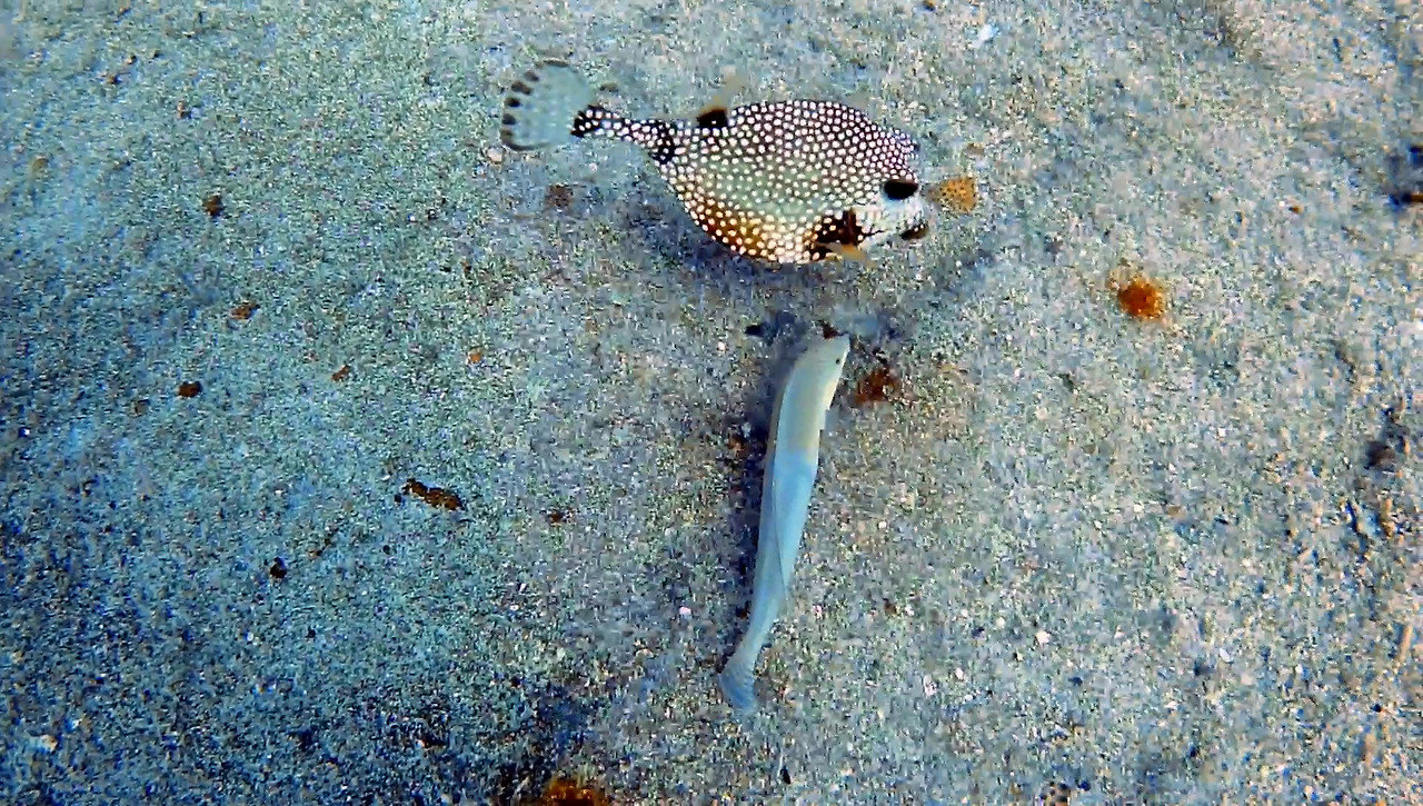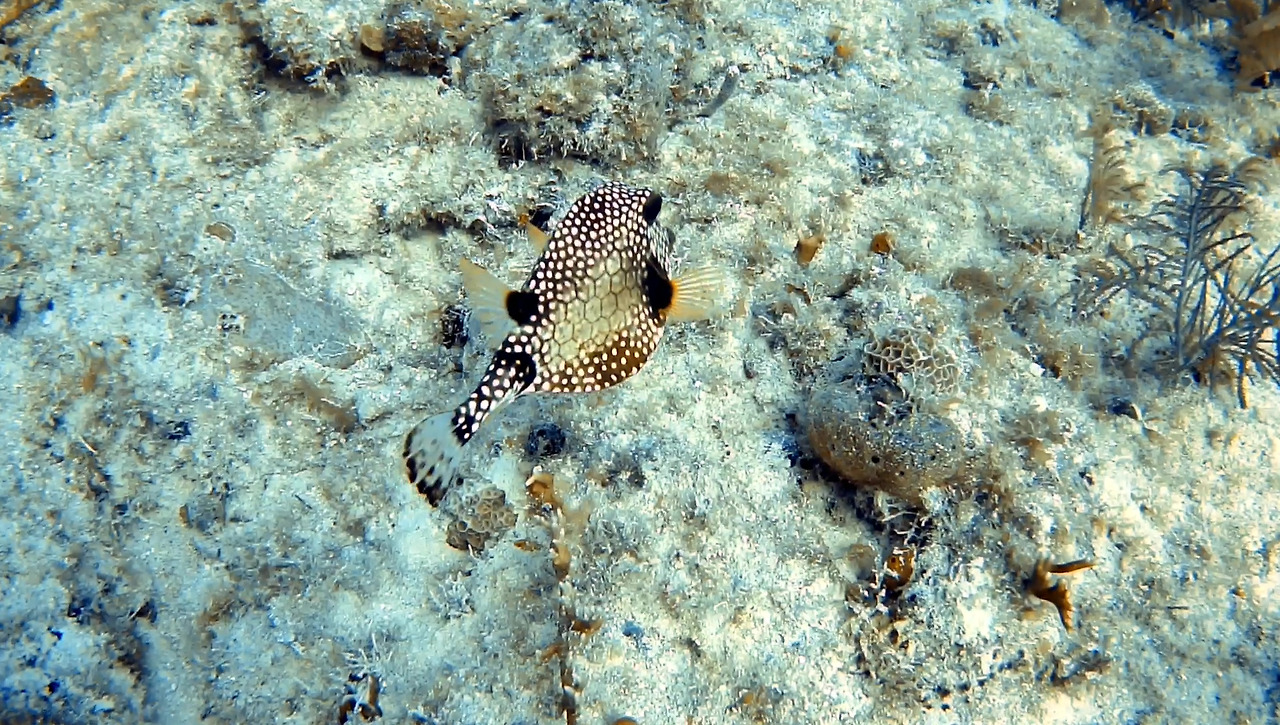 화려하면서도 묘하게 생긴 트렁크 피시 한 마리가 지나간다.