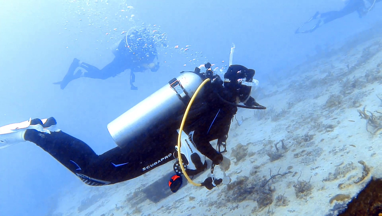 소라게 한 마리가 바다 바닥을 조용히 지나가다가 우리 눈에 걸렸다. 어찌 생겼는지 얼굴 좀 보고 싶지만 워낙 부끄럼쟁이라 안 보여준다. 뒤집어 볼 수도 있겠지만 키스 열도에서 다이빙하는 동안 바닷속 생물들을 건드리는 다이버는 한 명도 없었다.