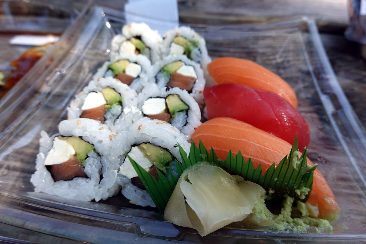 로터리 쪽 테이블에서 사 온 도시락을 꺼낸다. 캘리포니아롤과 스시 세트, 그리고 과일 모듬이다.