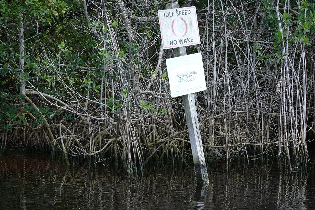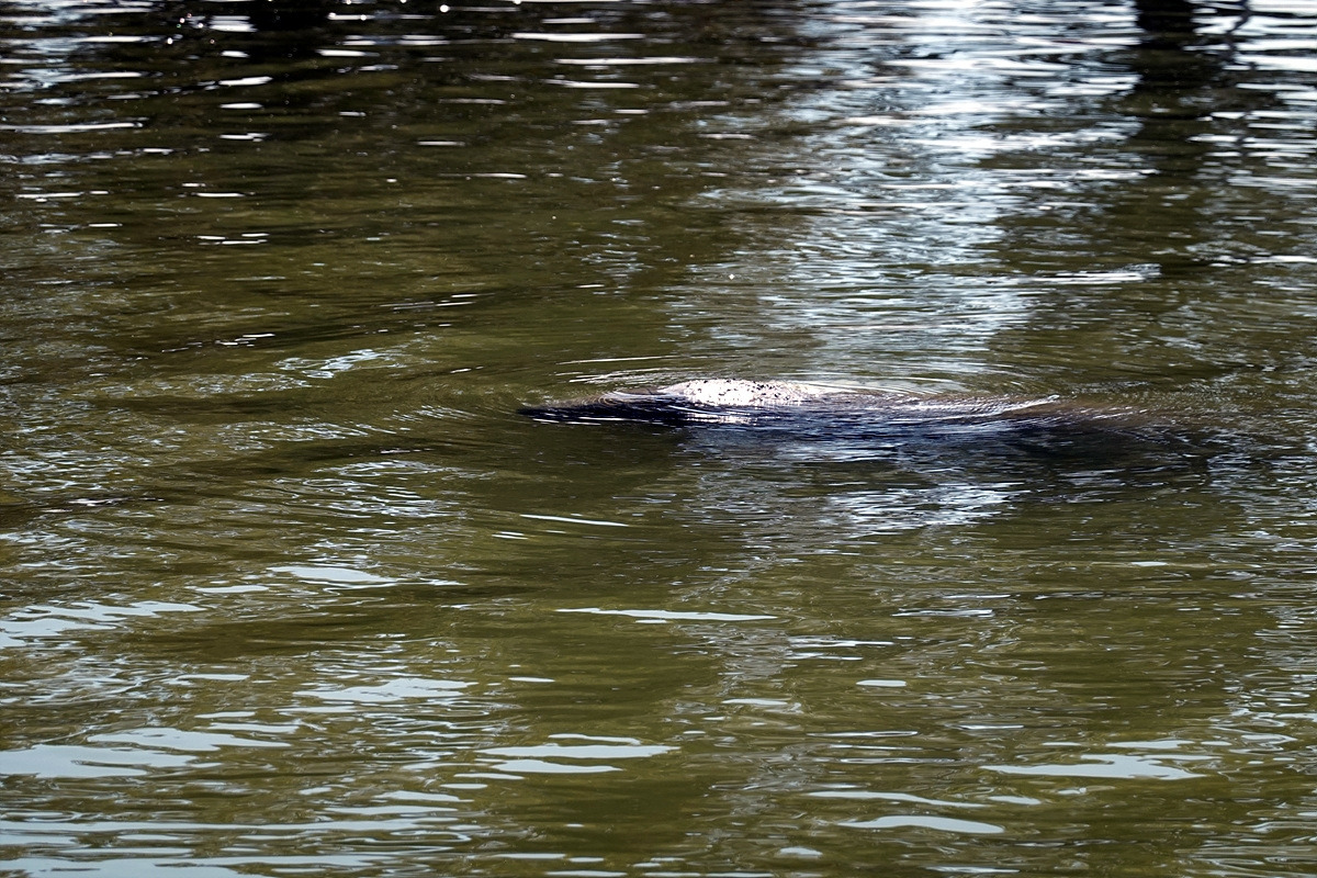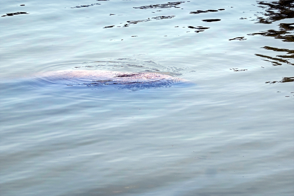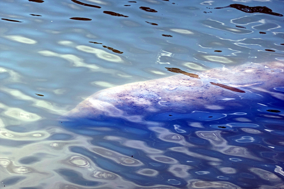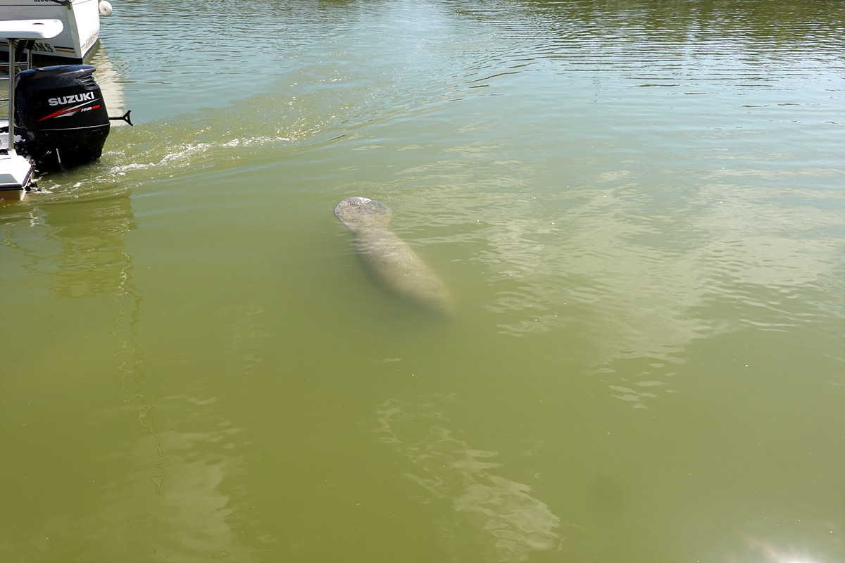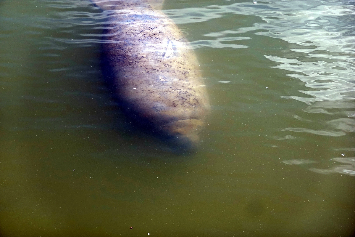 등에 상처가 난 녀석도 있다. 얕은 물에서 느릿느릿 돌아다니는 녀석들이라 가장 큰 사망 원인은 보트에 부딪히는 것이라고 한다. 이렇게 프로펠러에 상처 입은 매너티들이 많다.