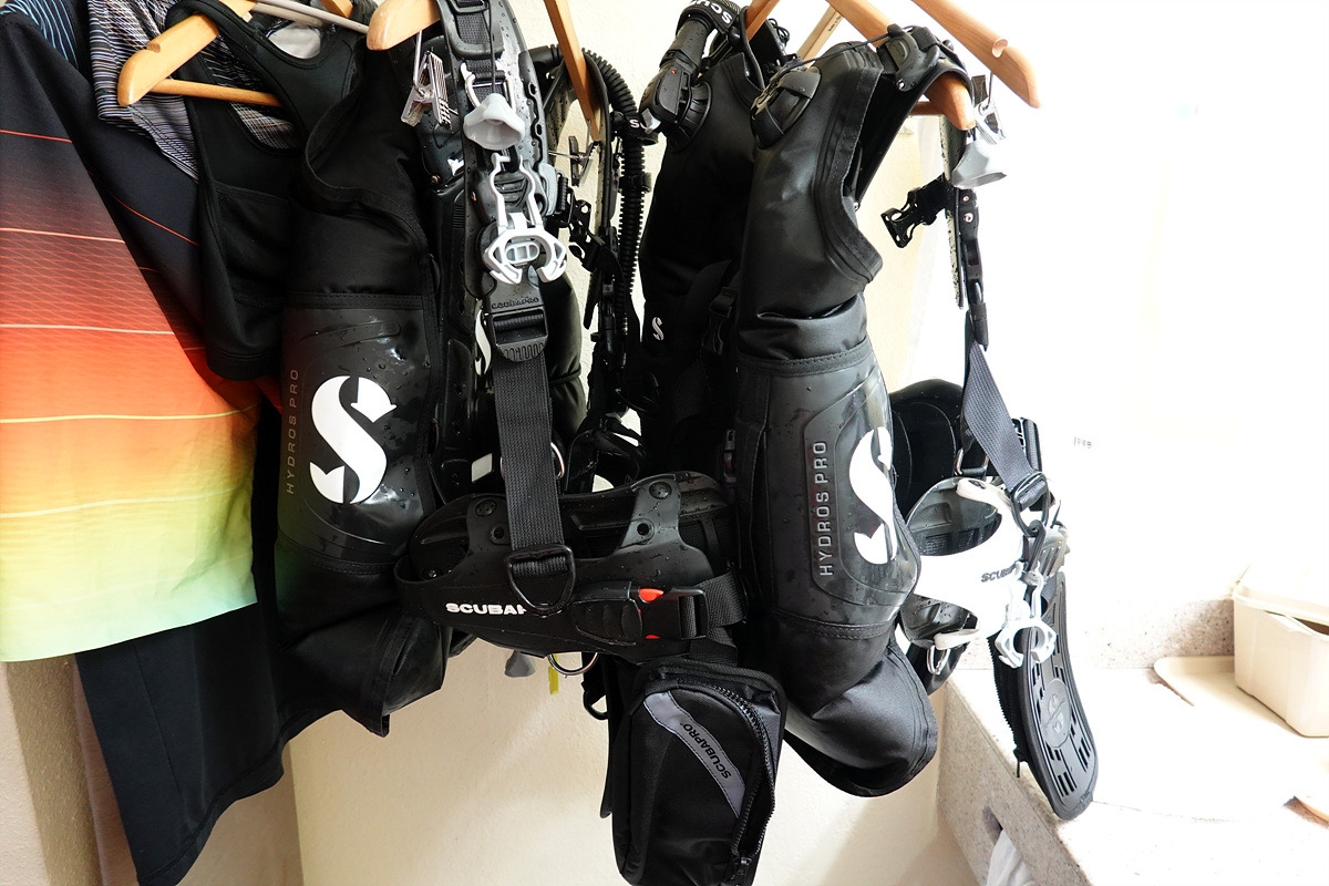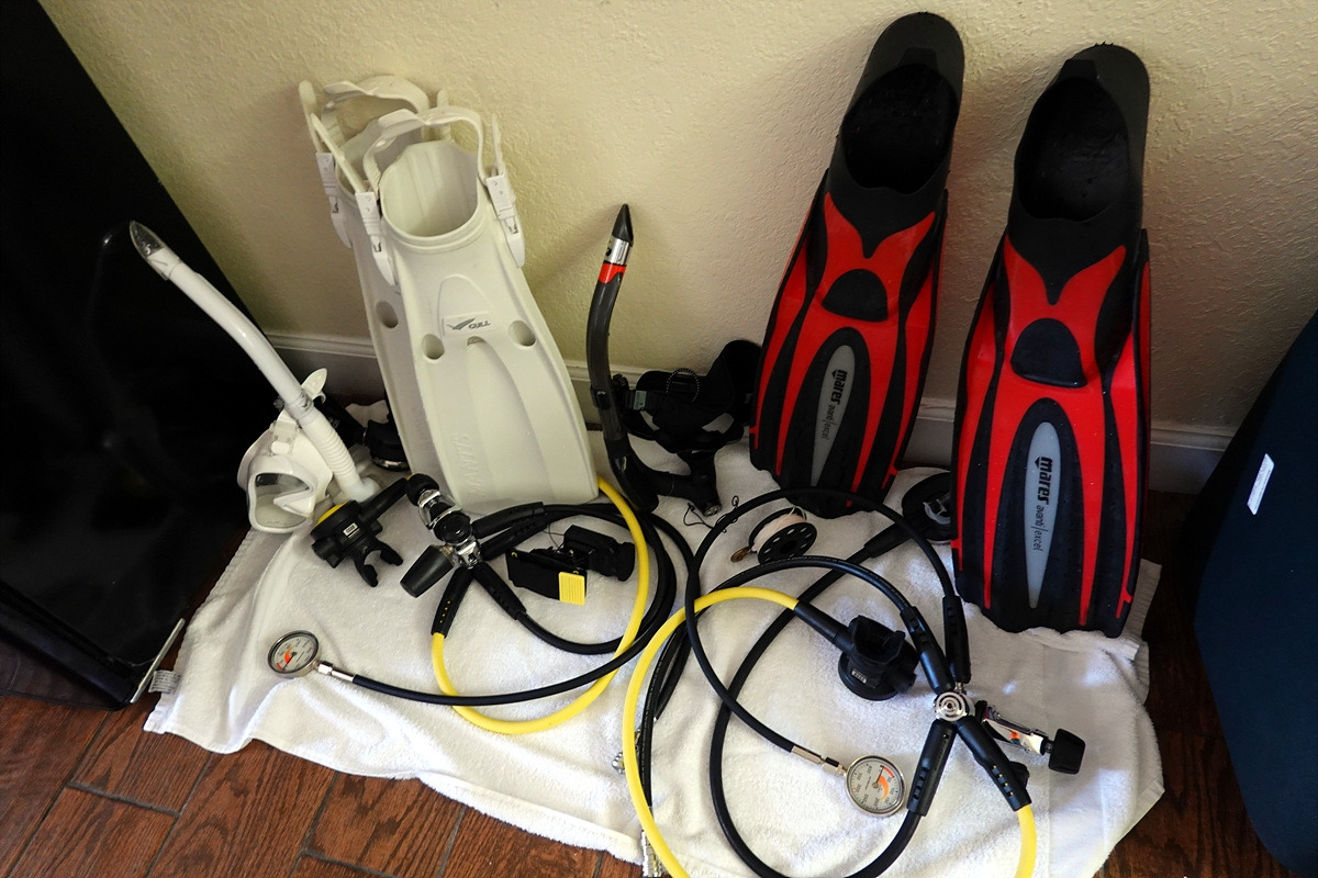 어제 숙소 구석에 널어두었던 다이빙 장비들이 아직 조금 덜 말랐다. 햇빛이 따듯하니 아침먹을 동안 야외 테이블 쪽에 잠깐 널어둔다.