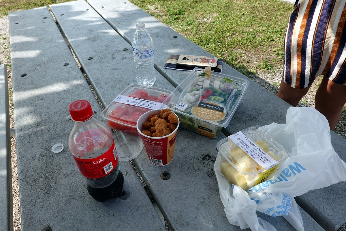 플라밍고 마리나 스토어 근처에 야외 테이블에서 점심을 먹기로 했다. 과일, 샐러드, 그리고 팝콘치킨. 마리나 스토어에서도 간단한 음식들을 파는데 그 외에는 식당이나 가게 같은 게 없다.