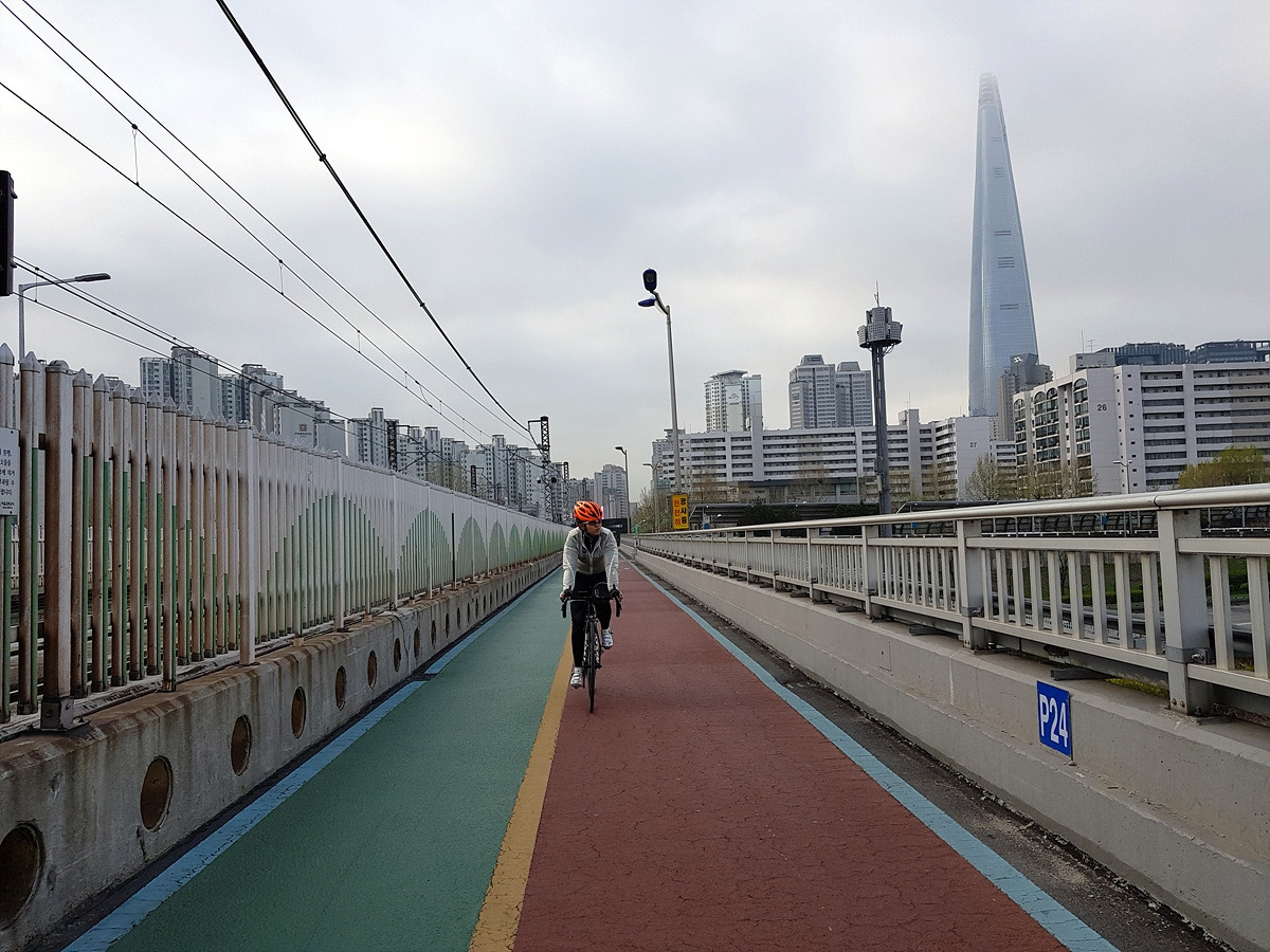 집에서 동서울 터미널까지 그리 멀지 않으니 자전거를 타고 잠실철교를 건너 간다.
