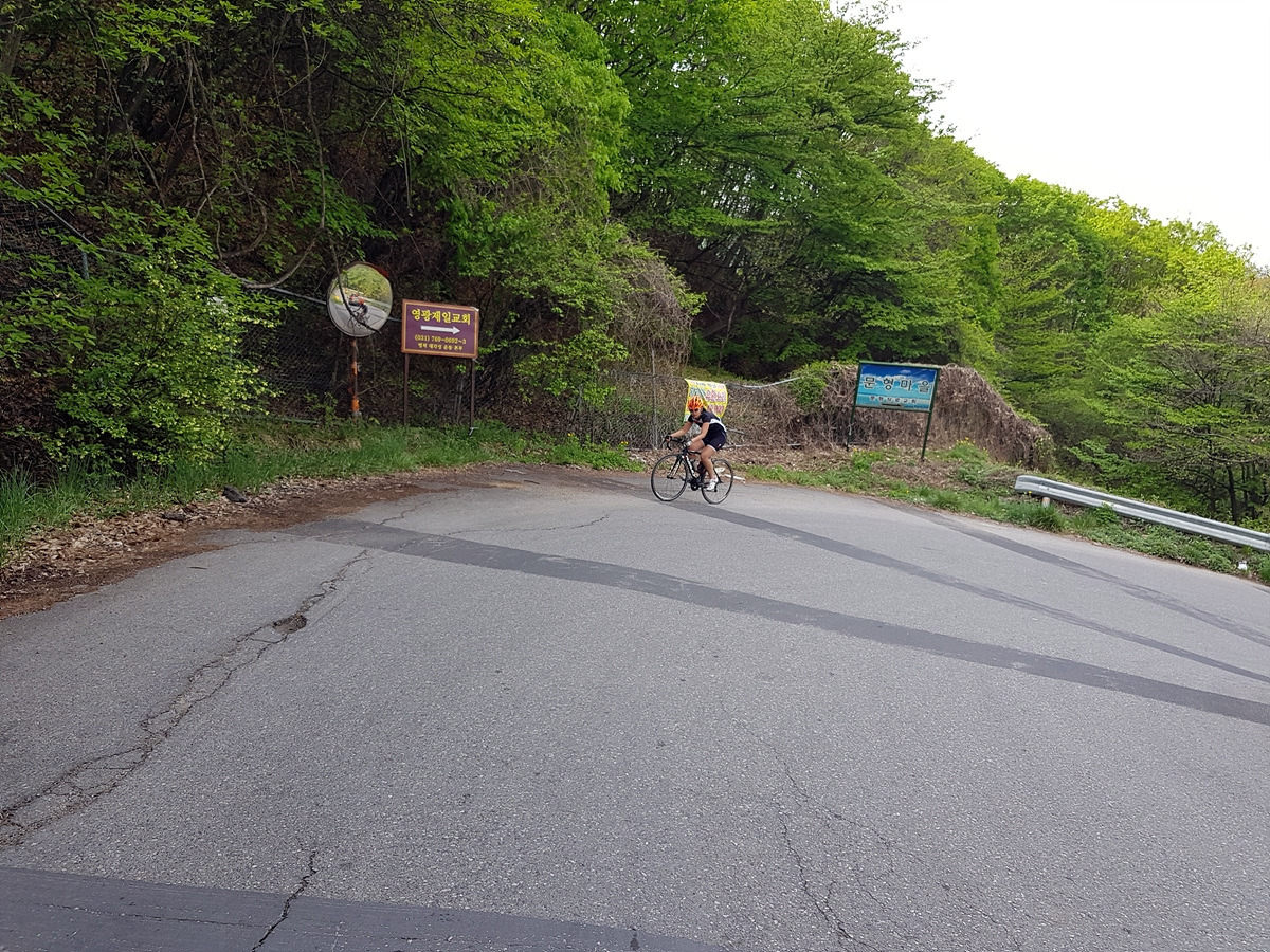 S자 두 번의 코스를 넘어서 약간 더 올라가면 강남300 고개의 정상에 도착한다.