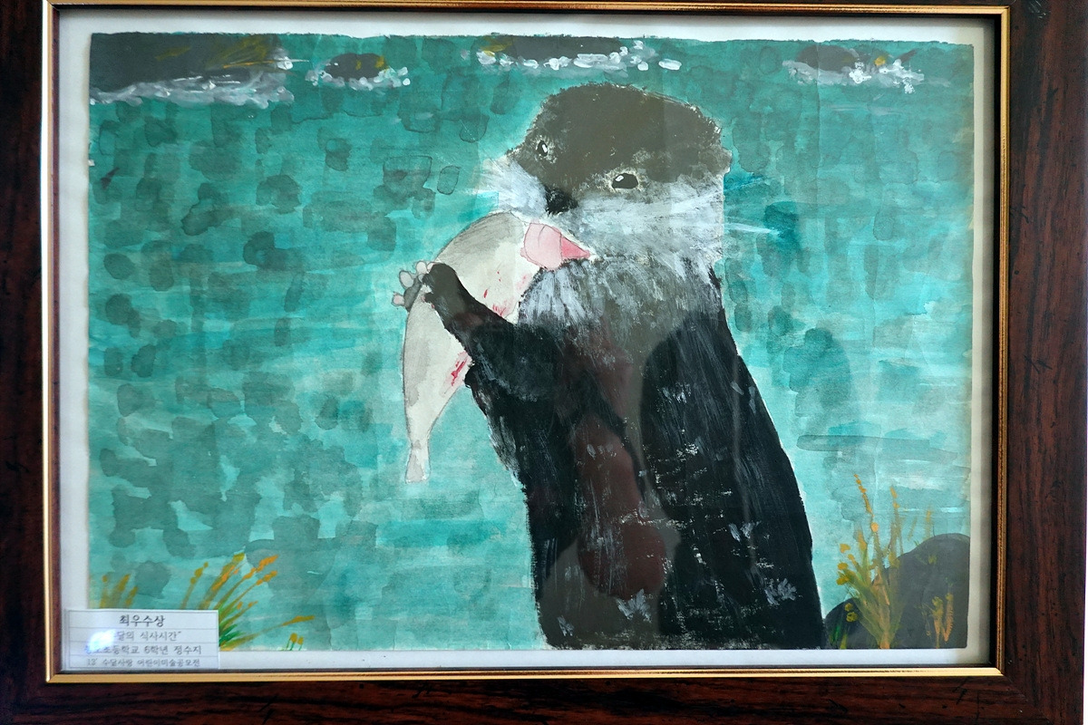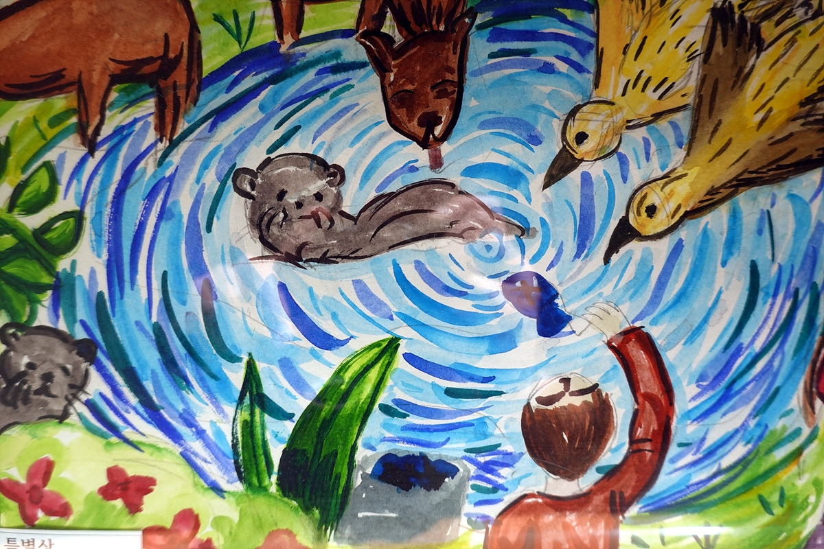 수달 발자국을 따라서 나선 통로로 아래층으로 내려간다. 통로 벽면에 아이들이 그린 수달 그림들을 볼 수 있다. 입상작들 답게 다들 잘 그렸다. 자세히 보면 보는 재미가 은근 쏠쏠하다.
