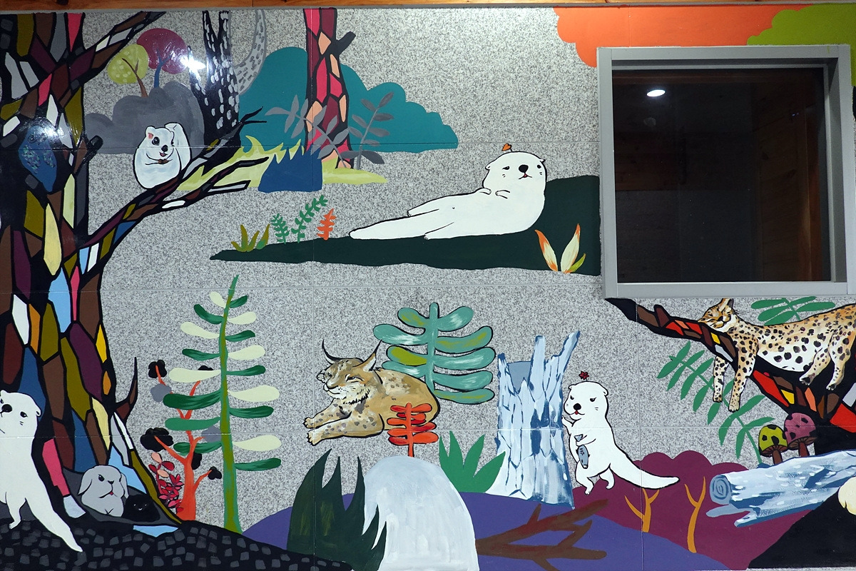 볼거리가 엄청 많지는 않지만 시설 전체가 수달로 잘 꾸며져 있다. 빈 벽면이나 화장실 벽면에도 이런 귀여운 수달 그림들로 가득 차있어 이런저런 수달 그림을 보는 재미가 있다.