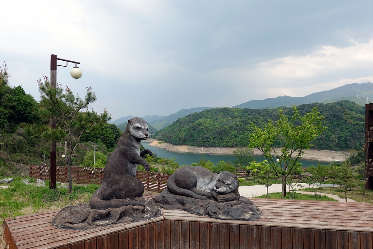 이제 수달들도 실컷 보았으니 슬슬 돌아갈 시간이다. 파로호를 배경으로 사육장과 관람센터가 잘 조성되어 있는데 워낙 구석진 곳에 있다 보니 방문객이 많지 않다. 우리가 돌아가려 할 때쯤에야 한 가족이 구경을 왔다. 토요일 오후 시간인데 겨우 두 팀이라니... 한적하게 즐기고 싶은 우리같은 사람에겐 최고다. 돌아가는 길의 수달상은 왜 이리 터프하게 생겼지...?