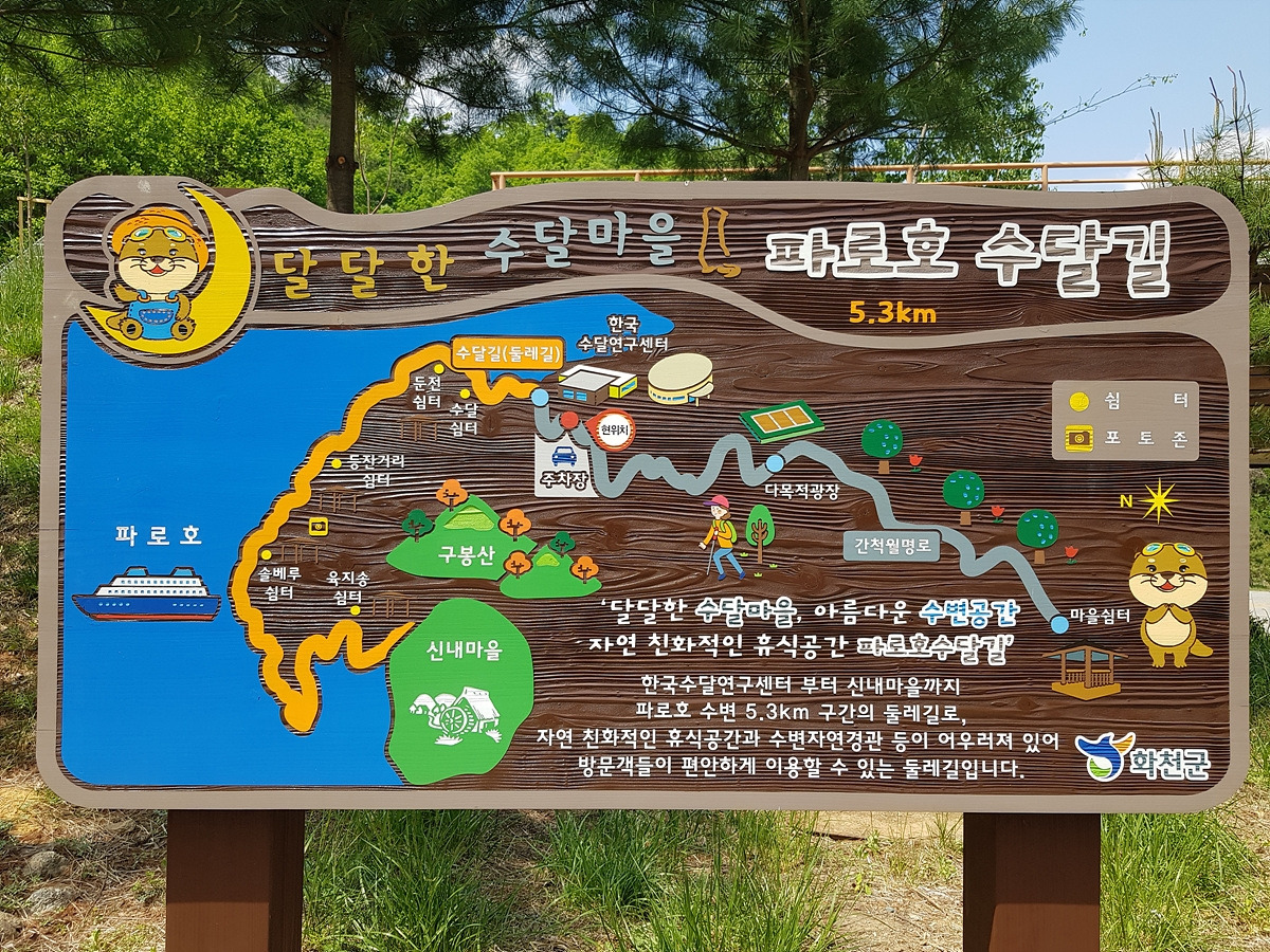 가평에서 여기까지 자전거를 타고 오긴 힘드니 자전거를 차에 싣고 출발해서 오후 1시 반쯤 수달연구센터 주차장에 도착했다. 주차장에 간단한 안내판이 있다. 안내판만 보면 뭐가 엄청 많은 동네 같은데 사실 수달센터와 파로호 외엔 아무것도 없는 곳이다. 마을 쉼터가 있는지는 모르겠고 다목적 광장인가는 한참 공사 중이고 오전에 자전거를 타느라 힘들었으니 수달길도 패스하고 수달연구센터만 둘러보기로 한다.