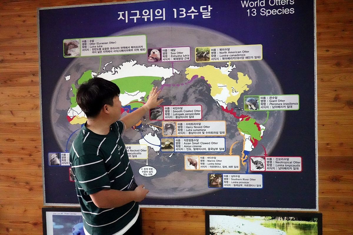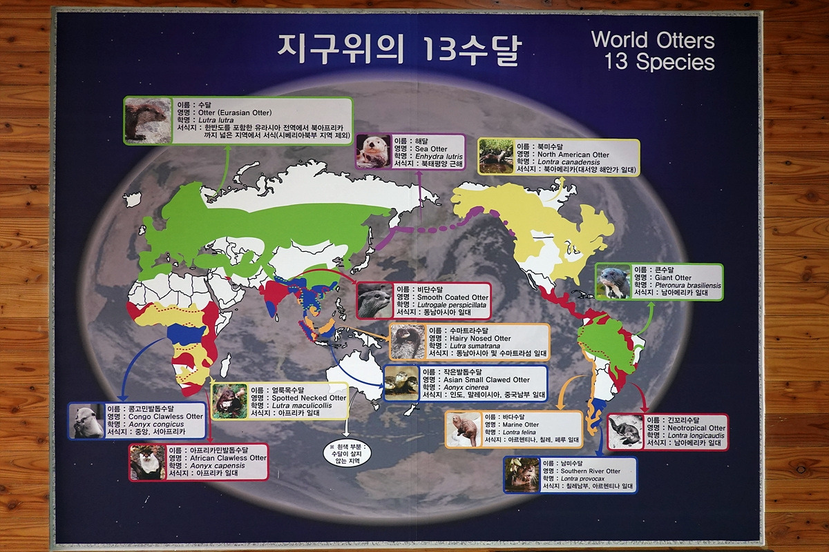 오후 3시가 다 되었으니 다시 안내데스크로 돌아간다. 역시나 다른 방문객은 없다. 연구원 선생님이 안내하면서 이것저것 알려준다. 수달은 귀엽게 생긴 외모와는 다르게 우리나라 하천 생태계의 최강자라는 타이틀을 가지고 있다. 큼직한 물고기를 좋아하는 수달들은 블루길, 베스, 황소개구리 같이 커다란 외래종 수중 동물들의 천적이라 그만큼 생태계에서 중요한 역할을 한다고 한다. 아마존에 사는 큰수달도 그쪽 민물 생태계의 강자이다 보니 피라니아, 아나콘다, 악어 같은 무시무시한 동물들도 잡아먹고 산다고 한다.