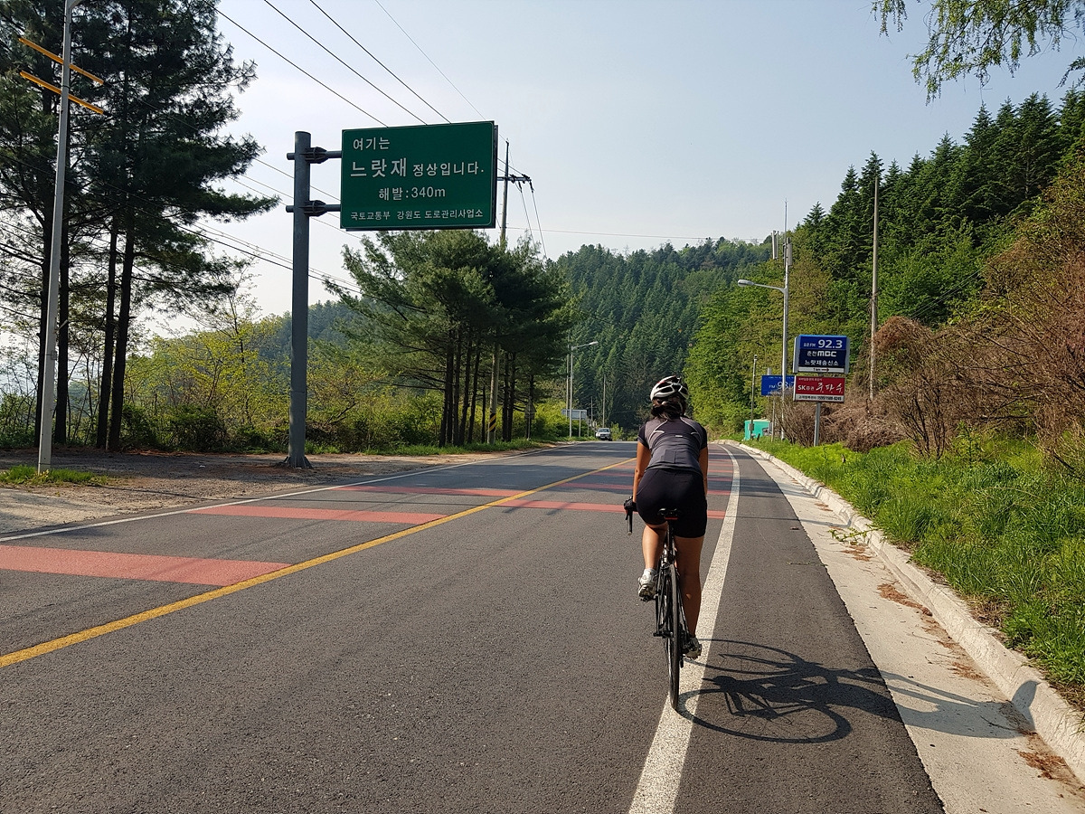 터널을 지나면 느랏재 정상 표지가 있다. 해발 340미터다. 강원도에서 1000미터 고지를 자주 넘다 보니 340미터라면 쉽게 느껴지는데 올라올 때마다 힘든 건 매 한 가지다.