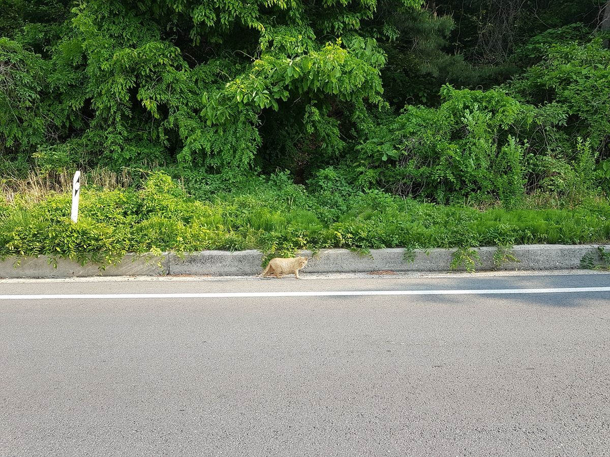 길 옆으로 고양이가 걸어가다 우리를 구경한다.