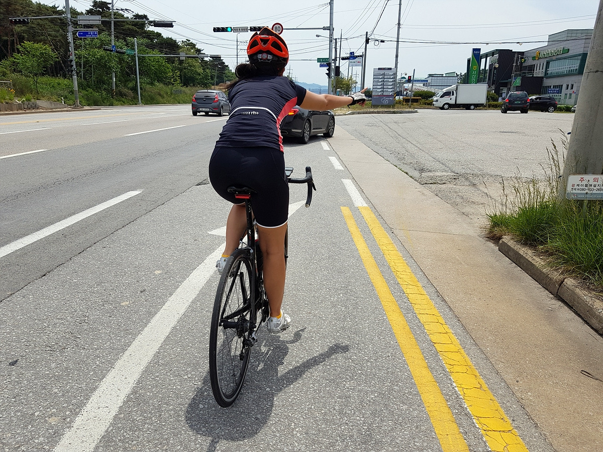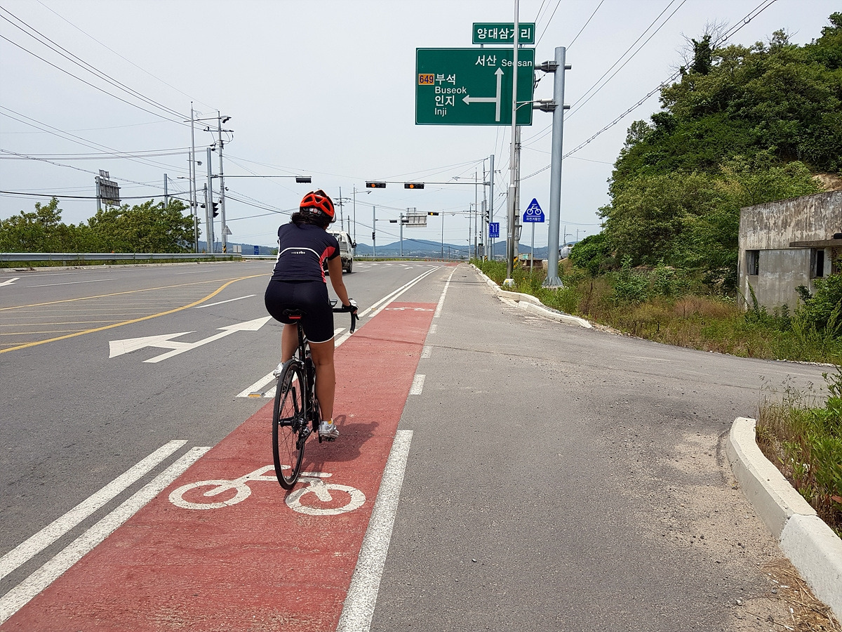 오오 큰길이라 차가 많을 것 같았는데 아예 한 차선을 분리해서 자전거길을 만들어 놓았다.