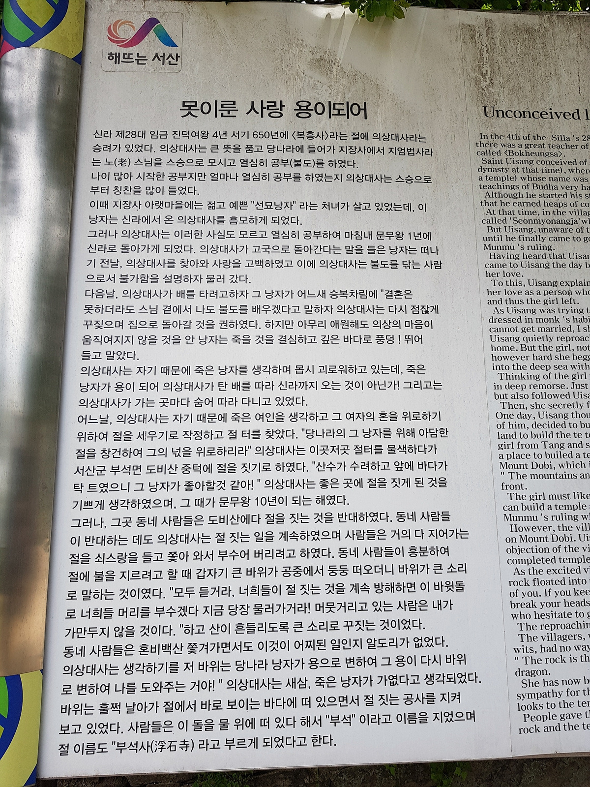 부석사는 신라시대 의상대사가 창건한 오래된 절로 의상대사의 창건 전설이 전해져 온다. 절이 지어지는 것을 바라보던 바위는 검은여라 하여 실제로 존재하는데 서산 간척지가 만들어지면서 지금은 육지가 되었다.