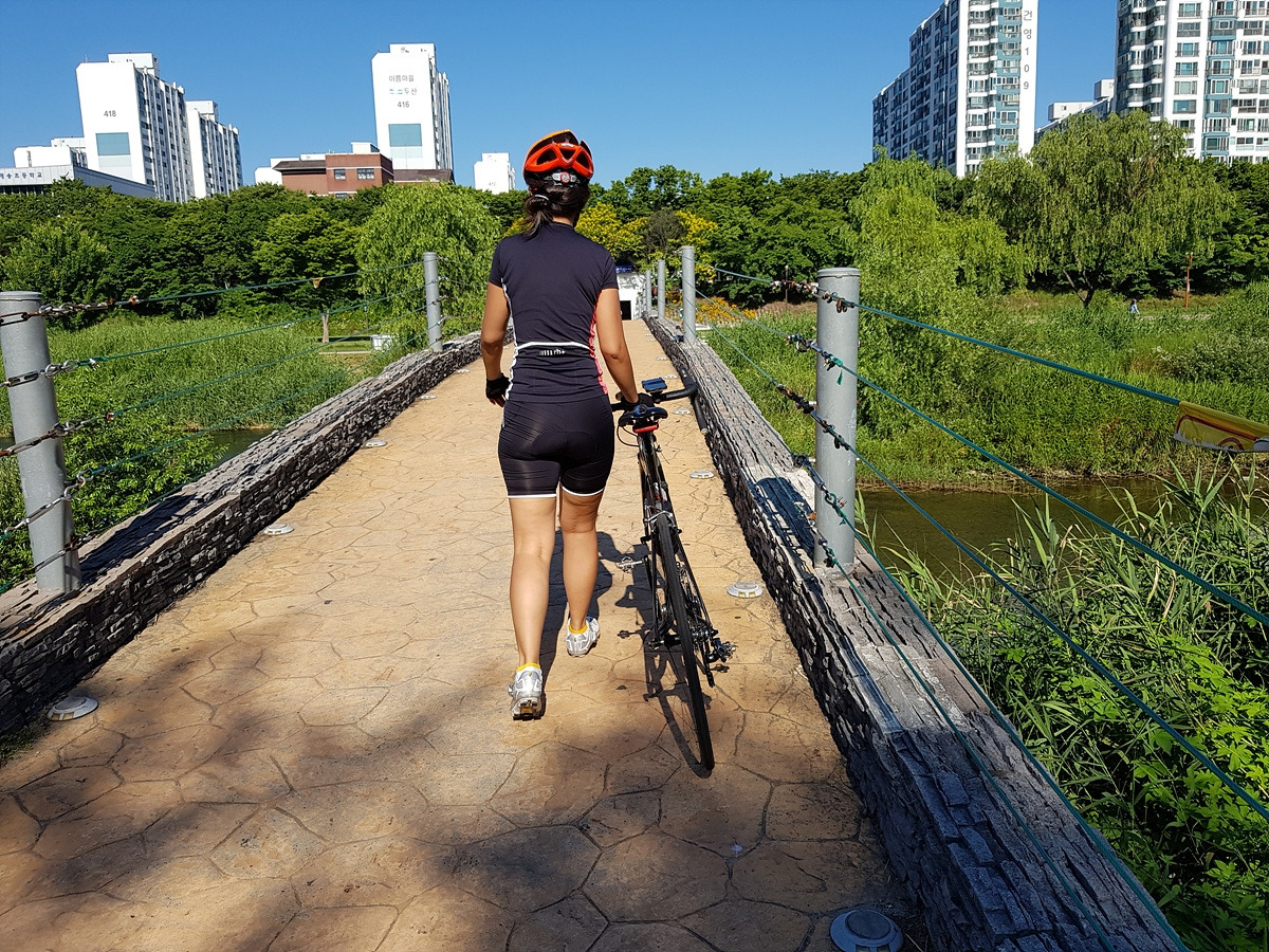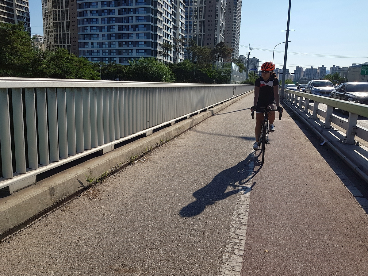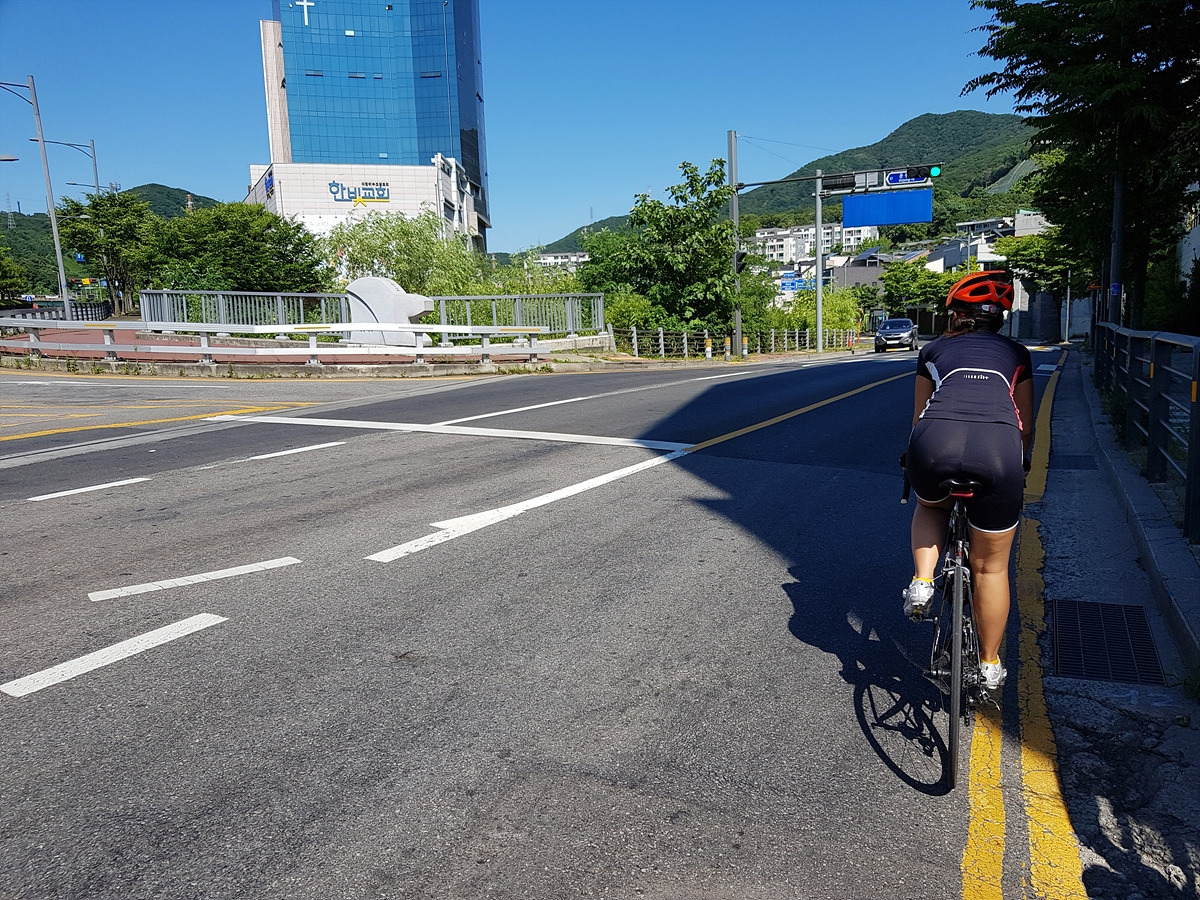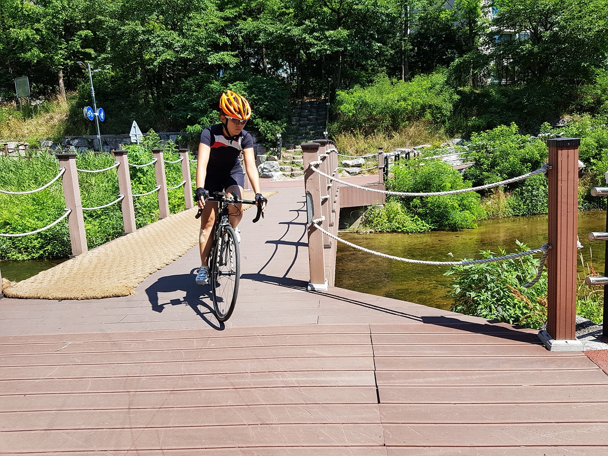 중간에 개천 우안으로 다리를 건널 수 있는 곳이 나오니 다리를 건너자. 건너지 않고 그대로 직진하면 죽전까지 도로로 가야 하는데 무려 43번 국도 구간이라 도로가 혼잡한 편이다.
