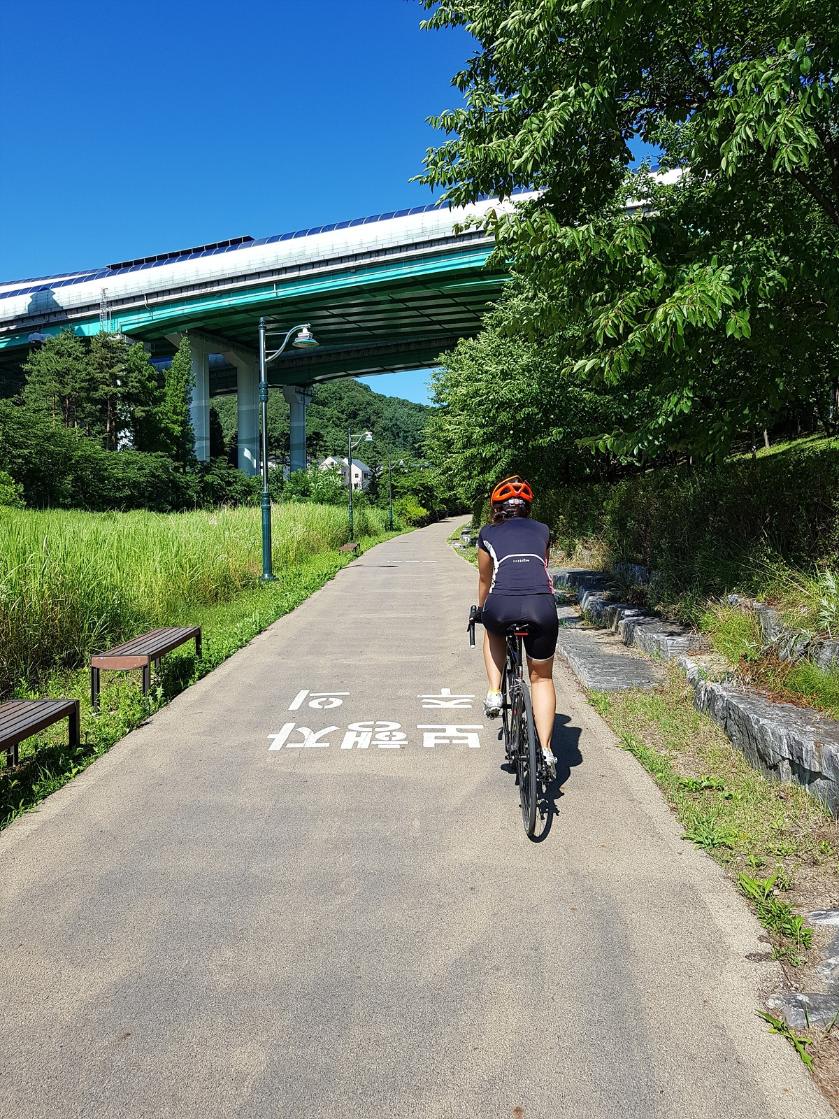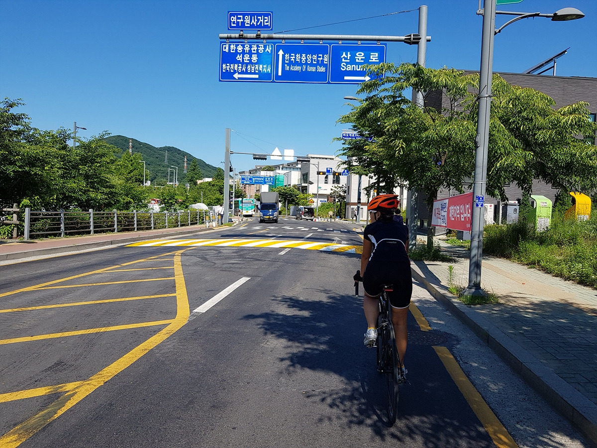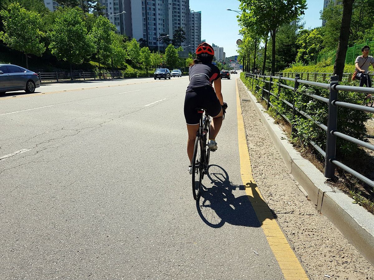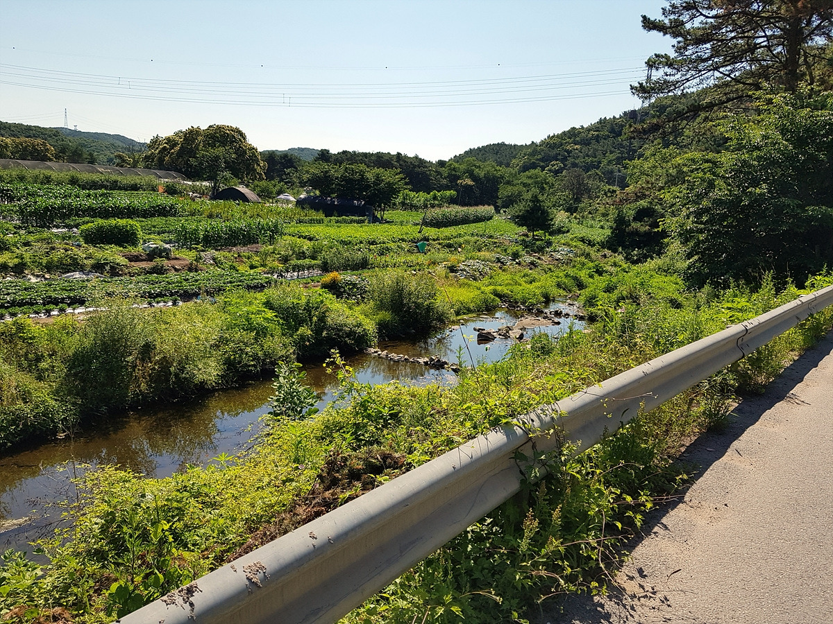 중간에 개천 우안으로 다리를 건널 수 있는 곳이 나오니 다리를 건너자. 건너지 않고 그대로 직진하면 죽전까지 도로로 가야 하는데 무려 43번 국도 구간이라 도로가 혼잡한 편이다.