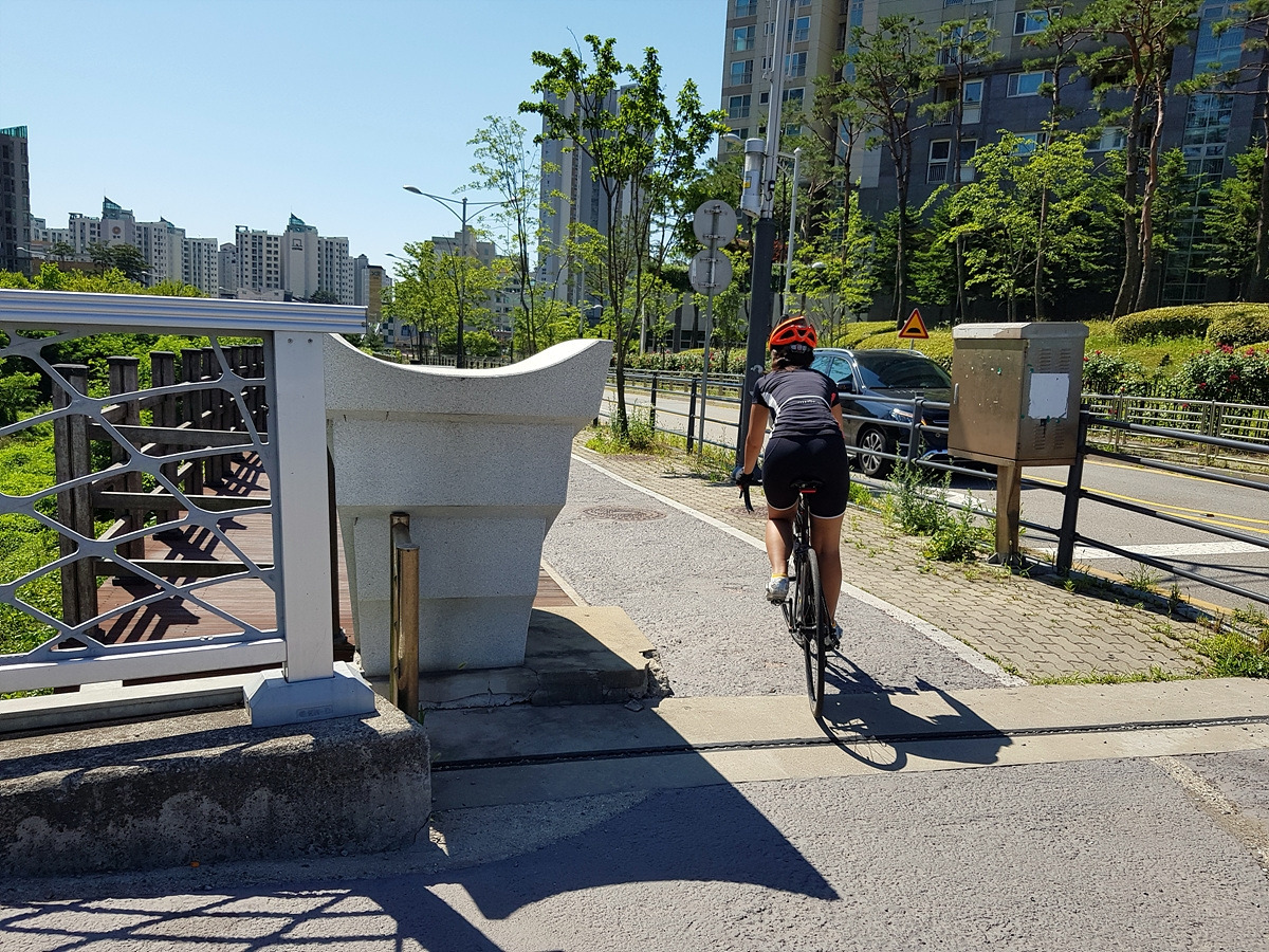 큰길로 나오자마자 아파트 사거리에서 풍덕천 자전거길을 찾아 내려가면 된다. 여기서 지니님이 인도턱에 미끄러졌는데 다행히 크게 다치지는 않았다.
