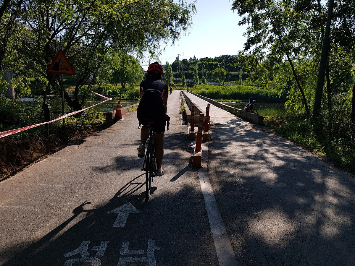 요즘 탄천은 자전거길 보수 공사가 한창이다. 평일에는 가끔 공사장비가 들어오느라 자전거 통행을 막을 때도 있다.