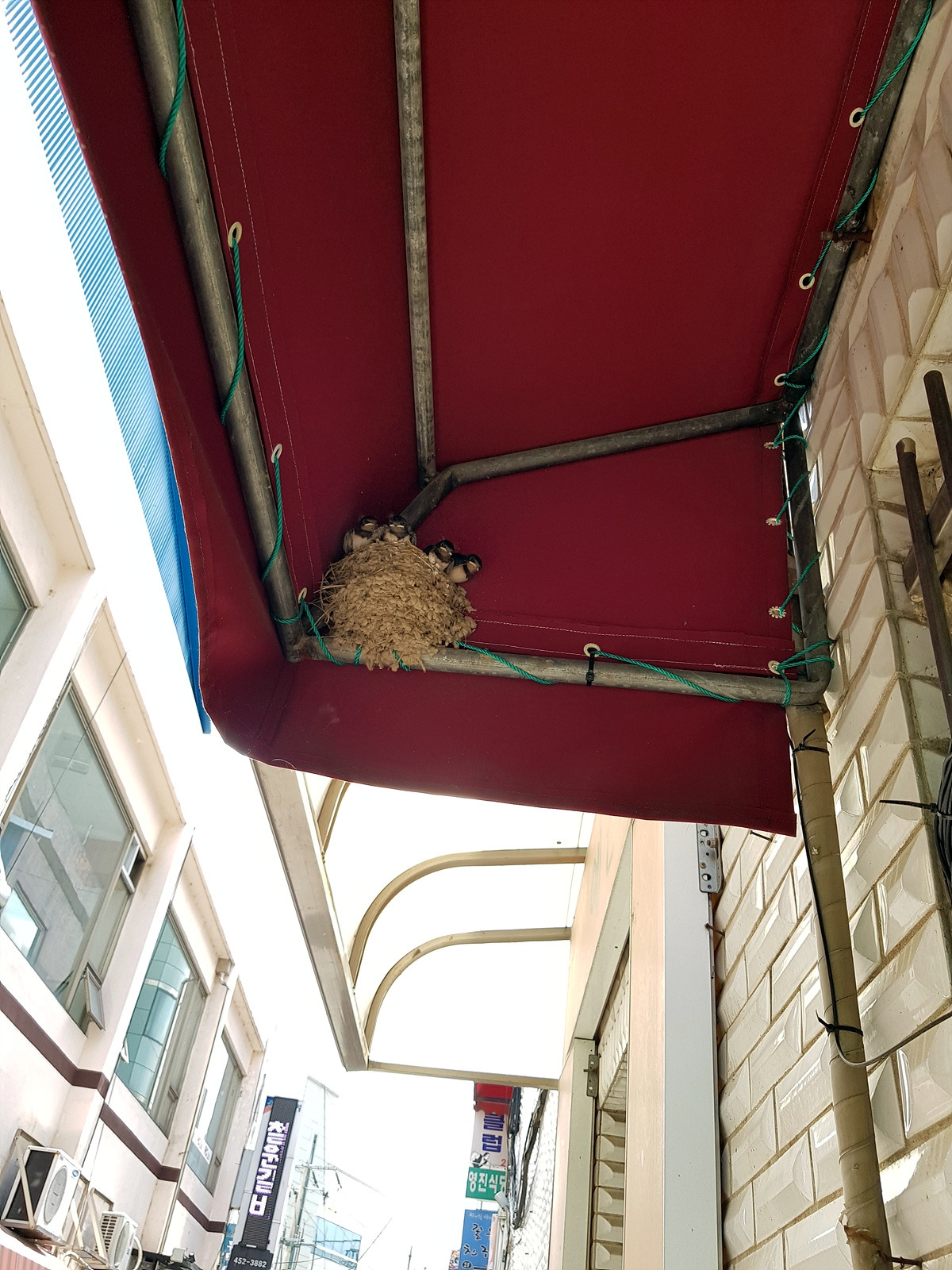 시장 골목에서 제비집을 보았더니 커다란 제비 새끼들이 비좁게 들어앉아있다. 다 큰 새끼가 네 마리나 되니 부모들이 열심히 먹이를 잡아 나르는 중이다. 제비 새끼들의 머리가 둥지 밖으로 보이면 여름이 온 것이다.